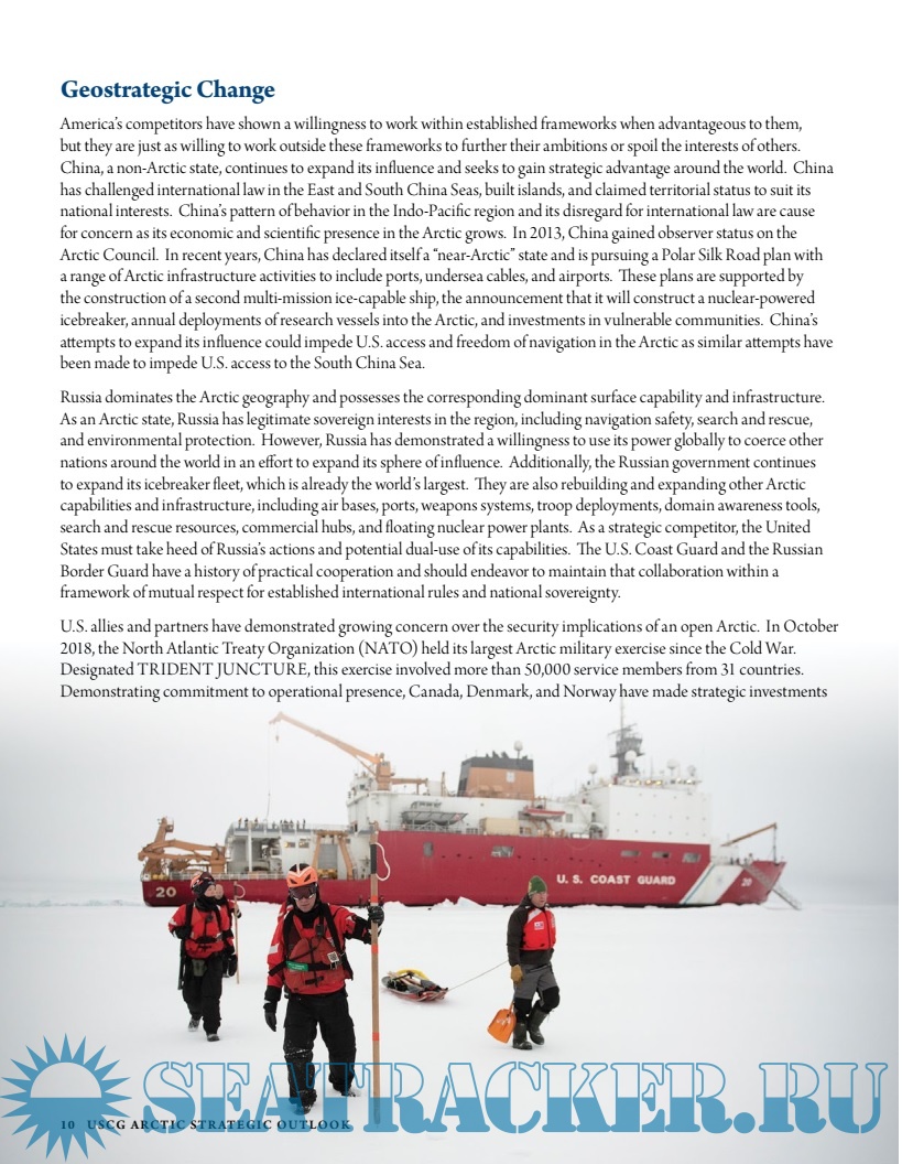 Description: Since the release of the Coast Guard Arctic Strategy in 2013, the renewal of global strategic competition has coincided with dramatic changes in the physical environment of the Arctic. The interaction of these drivers has made the Arctic a strategically-competitive space for the first time since the end of the Cold War. Competition does not preclude cooperation, and the Coast Guard will always look for opportunities to collaborate to solve complex issues. However, the Service must do so within the context of the Nation's national security interests.