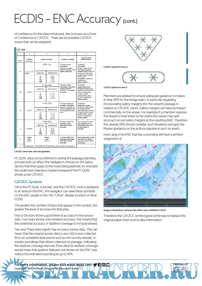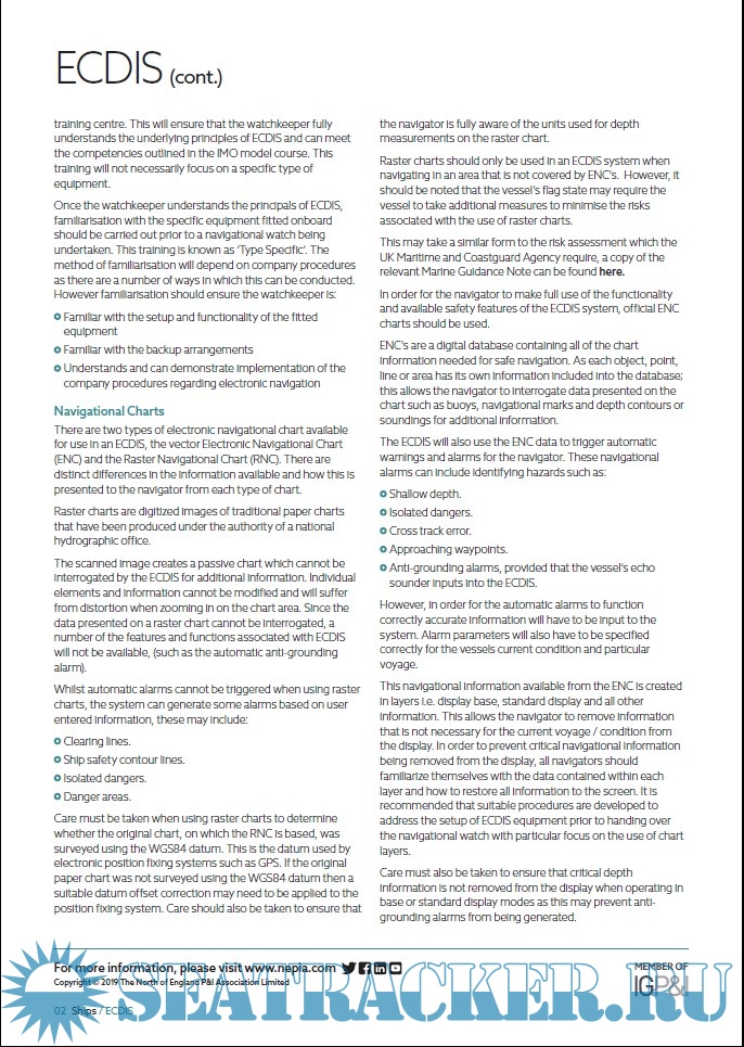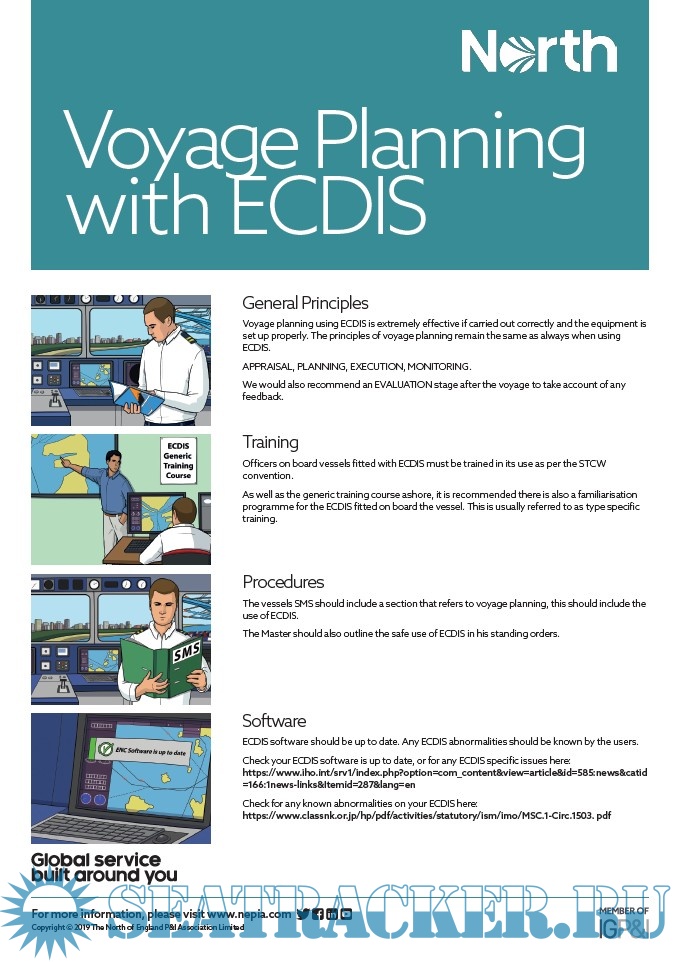 Year: 2019 Language: english Author: North of England P&I Association Publisher: North of England P&I Association Format: PDF Quality: eBook Pages count: 16 Description: North is a marine insurer company focused on safety culture and loss prevention, that also provides technical and operational expertise. These publications are on ECDIS general use, planning and ECDIS–ENC Accuracy. The folder contains three documents: 1. ECDIS (5 pages) is on ECDIS structure and implementation, training (STCW requirements), types of navigational charts and displaying features, and on operatioal use of ECDIS. 2. ECDIS–ENC Accuracy (9 pages). As paper charts, the data contained in the ENC is only as accurate as the original survey data from which it was made up. Therefore the bridge team should always be aware that a proper use of ENCs is essential, and the accuracy of ENCs is varied and subject to be carefully investigated. This publication briefly provides the OOW using ECDIS with information on determining the accuracy of the information displayed on their ENC. 3. Voyage Planning with ECDIS (2 pages) is a resume of basic good practices and a checklist on voyage planning.