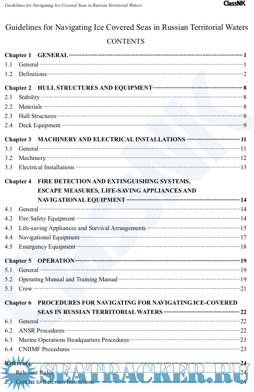 Year: 2009 Language: english Author: ClassNK Genre: Guide Publisher: Class NK Format: PDF Quality: eBook Pages count: 34 Description: As global demand for energy rises, there has been an active increase in the development of oil, natural gas and other natural resources in the resource rich region of the Arctic Ocean and ice bound seas of Sakhalin. As a result, it is anticipated that there will be an increase in the number of ships that will navigate these ice-bound waters in the years ahead. Moreover, it is quite likely that the Arctic Ocean will become a regular sea route for international trade between East and West due to the effects of global warming. Ships that operate in low temperature areas where ice exists, known as sea ice areas, need to have a hull structure capable of withstanding contact with the ice. Moreover, de-icing and other measures against low temperature need to be taken to prevent the freezing and icing of propulsion machinery, deck machinery and equipment, and other installations onboard ship. In addition, ports and countries with jurisdiction over sea ice areas generally institute independent regulations and policies regarding operations in these areas. Thus, careful attention also needs to be given to the regulatory controls and associated supporting systems put in place by each jurisdictional port and country with respect to the design plans and operation of ships that navigate such waters. For example, it is well known that ships wishing to navigate the Arctic sea route or sail to Sakhalin need to secure permission from the Russian government and obtain certificates issued by certain agencies within the Russian government before they can do so. From such a background, the Guidelines for Navigating Ice Covered Seas in Russian Territorial Waters were prepared for ships that satisfy the hull structure and structural requirements for propulsion machinery stipulated in ClassNK's Rules and Guidance for the Survey and Construction of Steel Ships, Part I: Polar Class Ships and Ice Class Ships. As such, the guidelines describe the measures necessary for operating in ice sea areas and polar waters as well as explain the procedures and related matters necessary to sail through Russian waters.