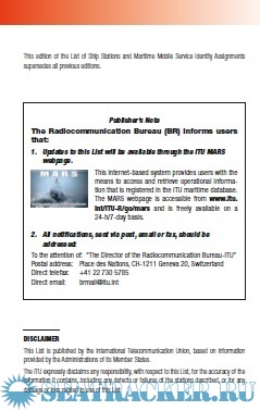 Year: 2020 Language: english Author: ITU Genre: Technical book Publisher: ITU Format: PDF Quality: eBook Pages count: 139 Description: List V – List of Ship Stations and Maritime Mobile Service Identity Assignments (2020) Multilingual The List of Ship Stations and Maritime Mobile Service Identity Assignments (List V) is a service publication prepared and issued, once a year, by the International Telecommunication Union (ITU), in accordance with provision no. 20.8 of the Radio Regulations (RR). As stipulated in Appendix 16 to the RR, this List shall be provided to all ship stations for which a Global Maritime Distress and Safety System (GMDSS)installation is required by international agreement. The List is published in CD-ROM format and contains the Preface and Reference tables in a booklet form. The CD-ROM contains information concerning Ship stations, Coast stations and Search and Rescue (SAR) aircraft for which an MMSI has been notified to the Radiocommunication Bureau as well as other ship stations, predetermined groups of ship stations, Accounting Authority Identification Codes (AAICs) and contact information of notifying administrators. The CD-ROM also includes a database, which enables users to search for and display, particulars and details of ship stations, Accounting Authorities and countries responsible for the notifications. New edition released annually in April or May.