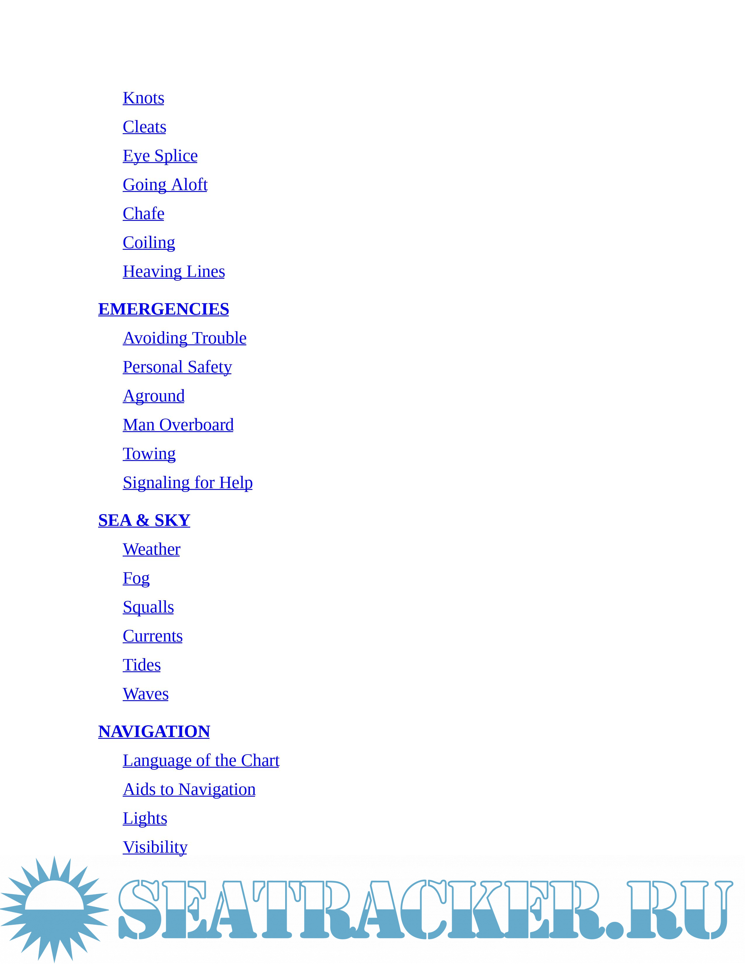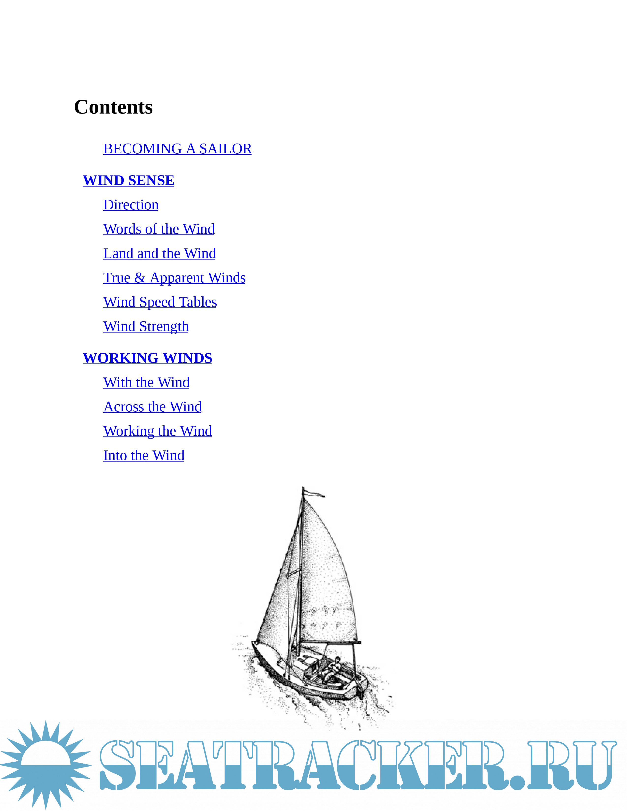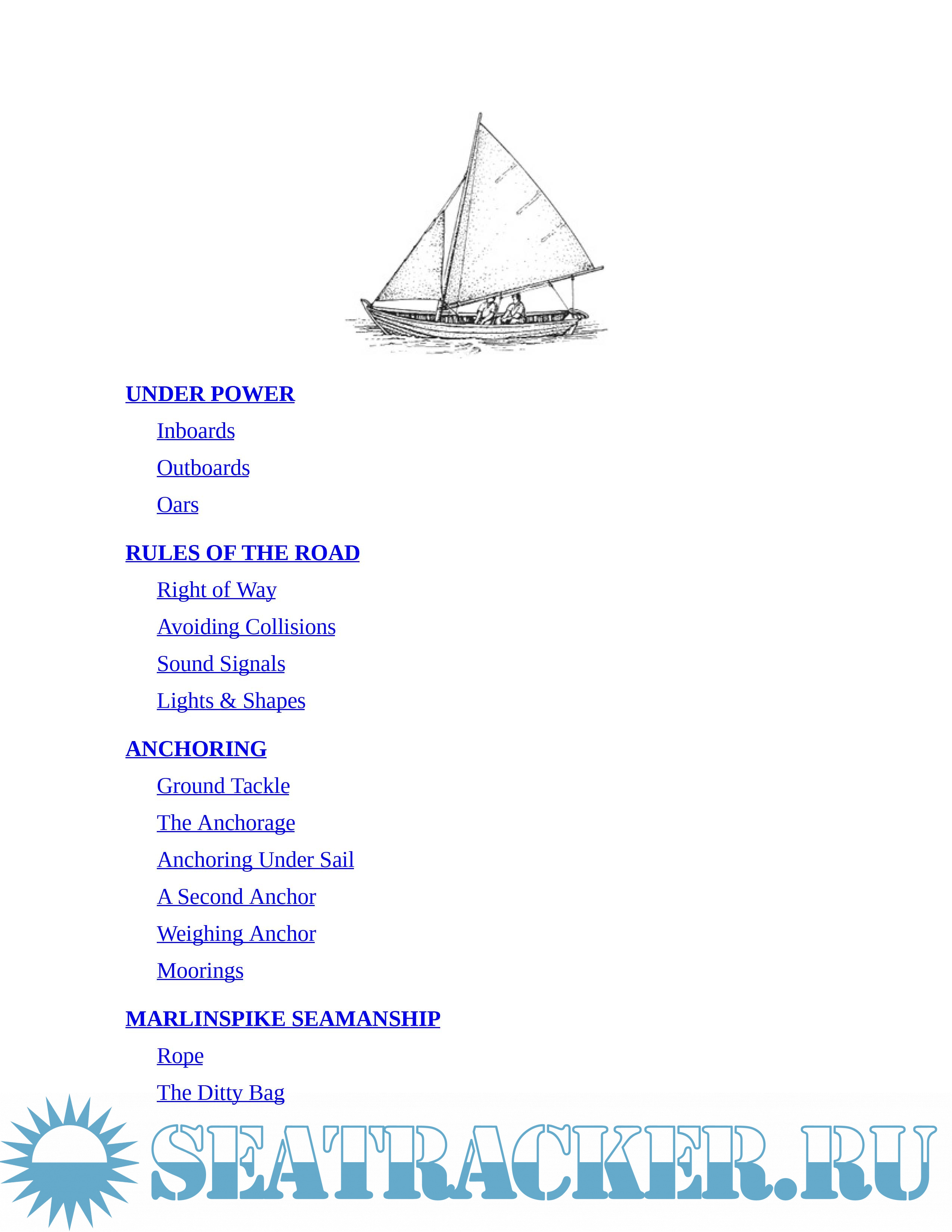 Topics include: Wind Sense; Working Winds; Getting Underway; The Boat; Rigging; Sails; Under Power; Rules of the Road; Anchoring; Ropework; Marlinspike Seamanship; Emergencies; Sea and Sky; Navigation; Racing; Trailering