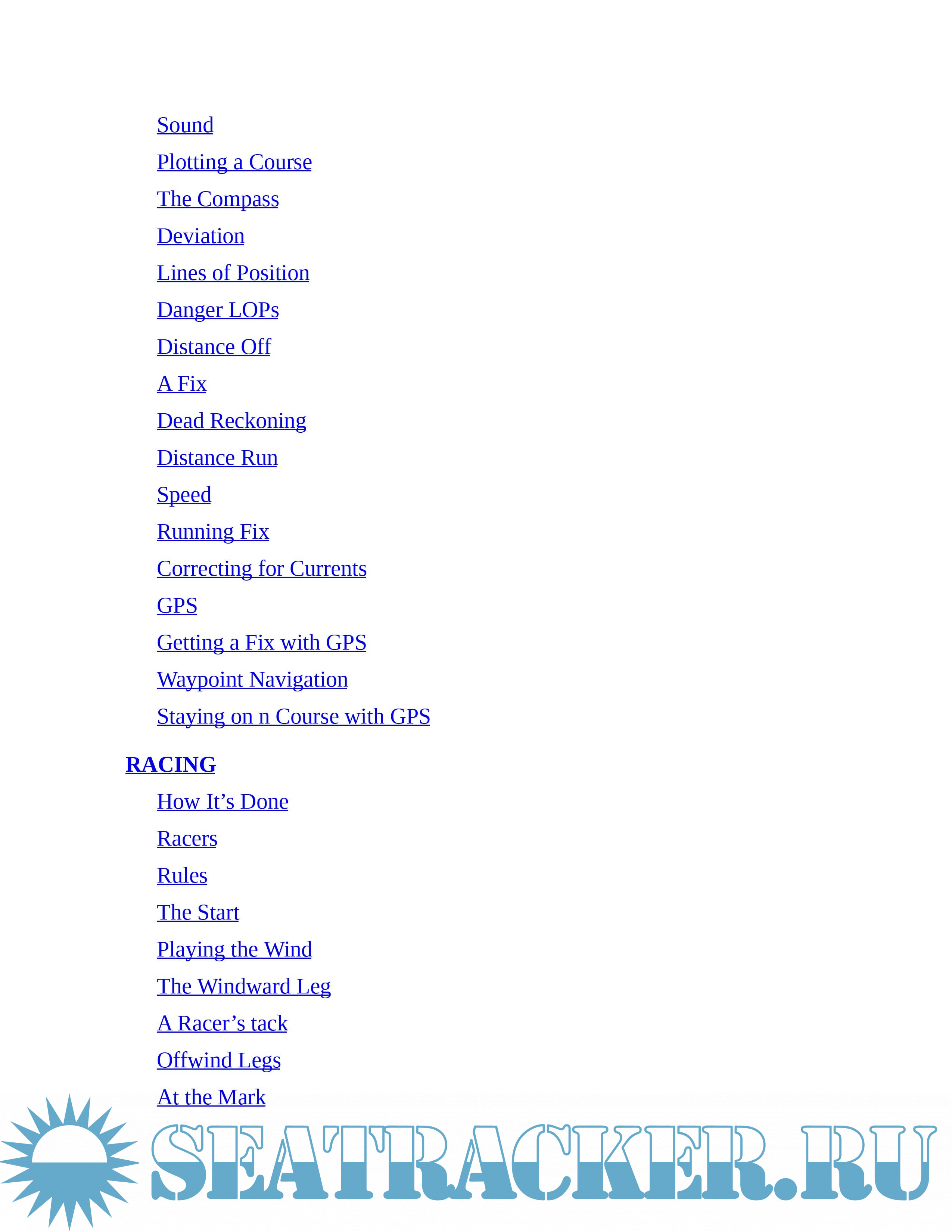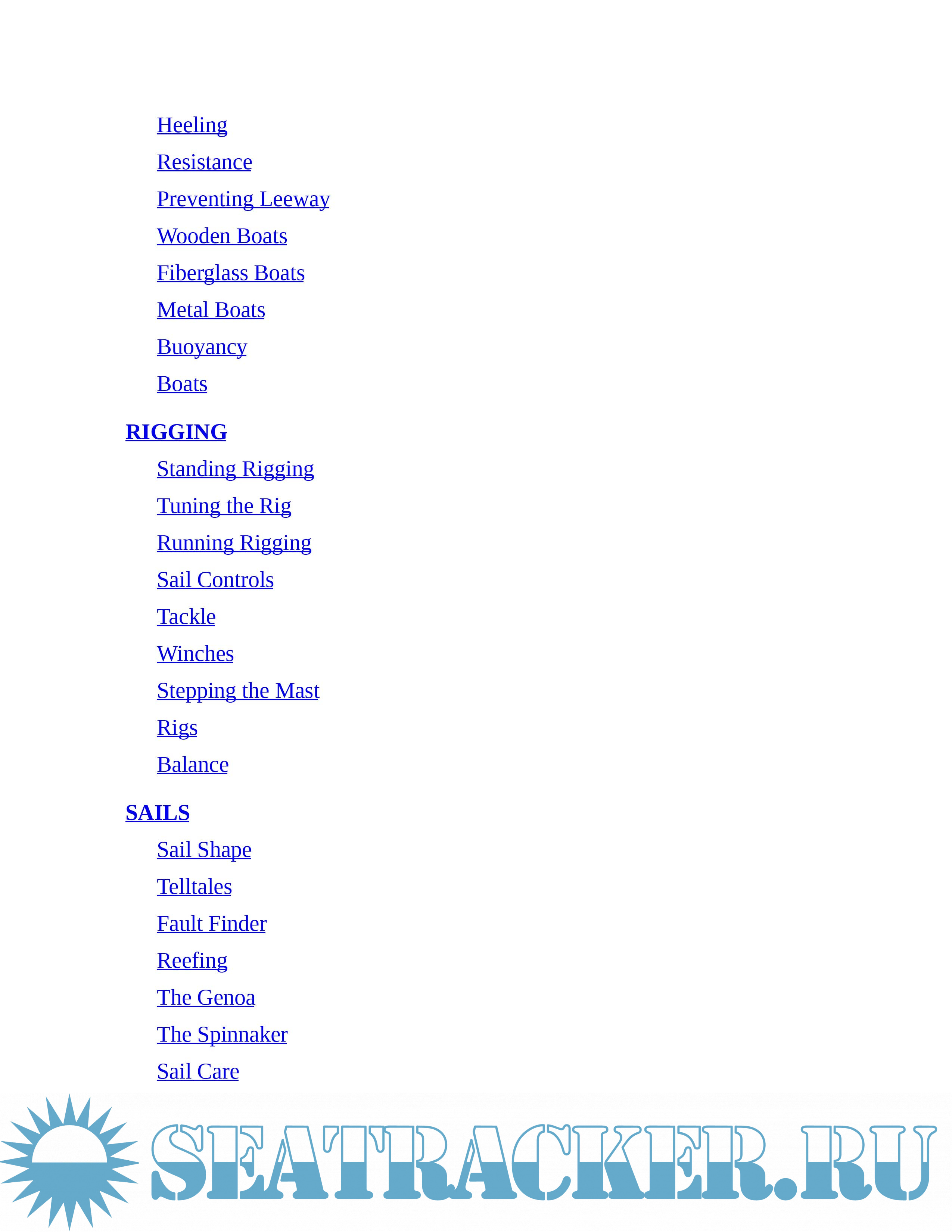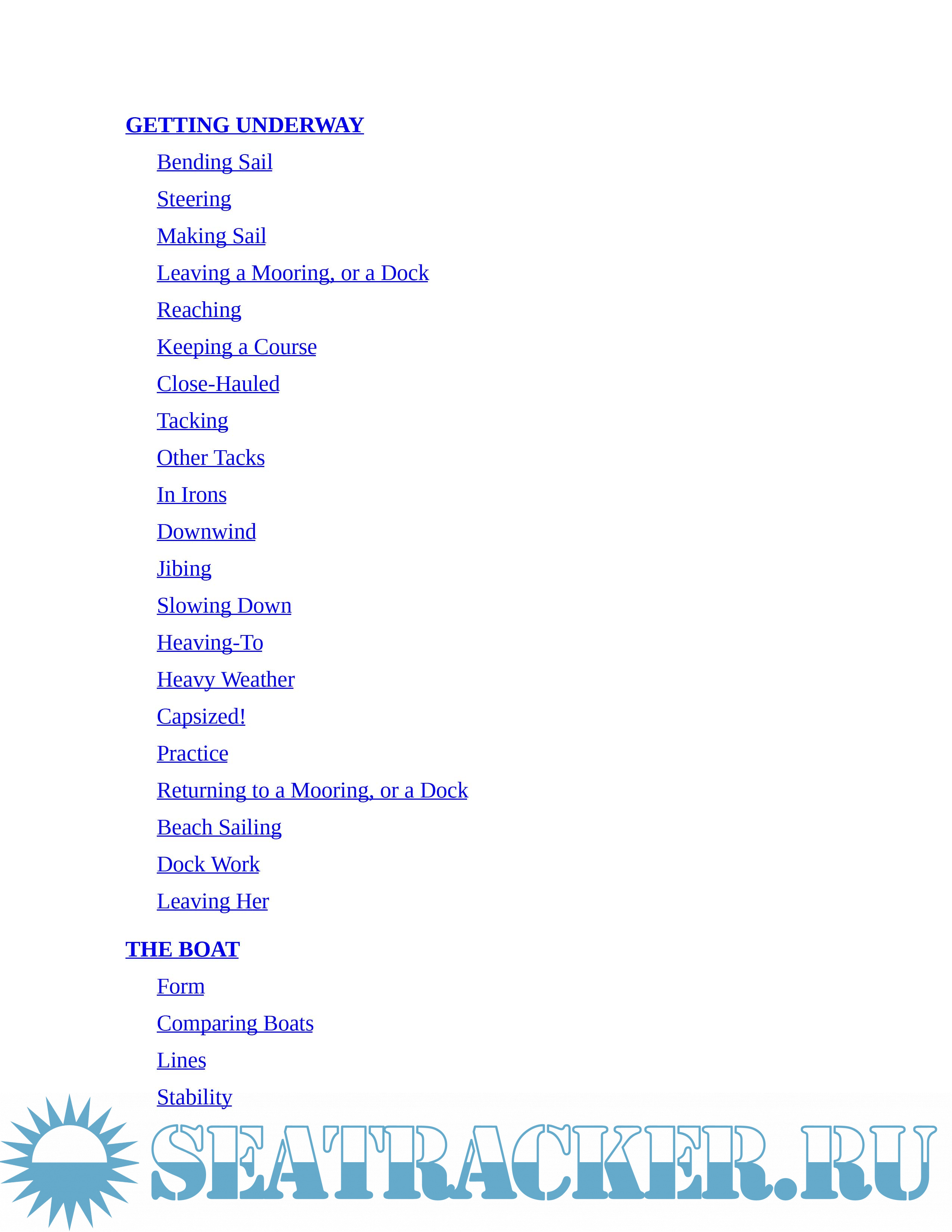 Topics include: Wind Sense; Working Winds; Getting Underway; The Boat; Rigging; Sails; Under Power; Rules of the Road; Anchoring; Ropework; Marlinspike Seamanship; Emergencies; Sea and Sky; Navigation; Racing; Trailering