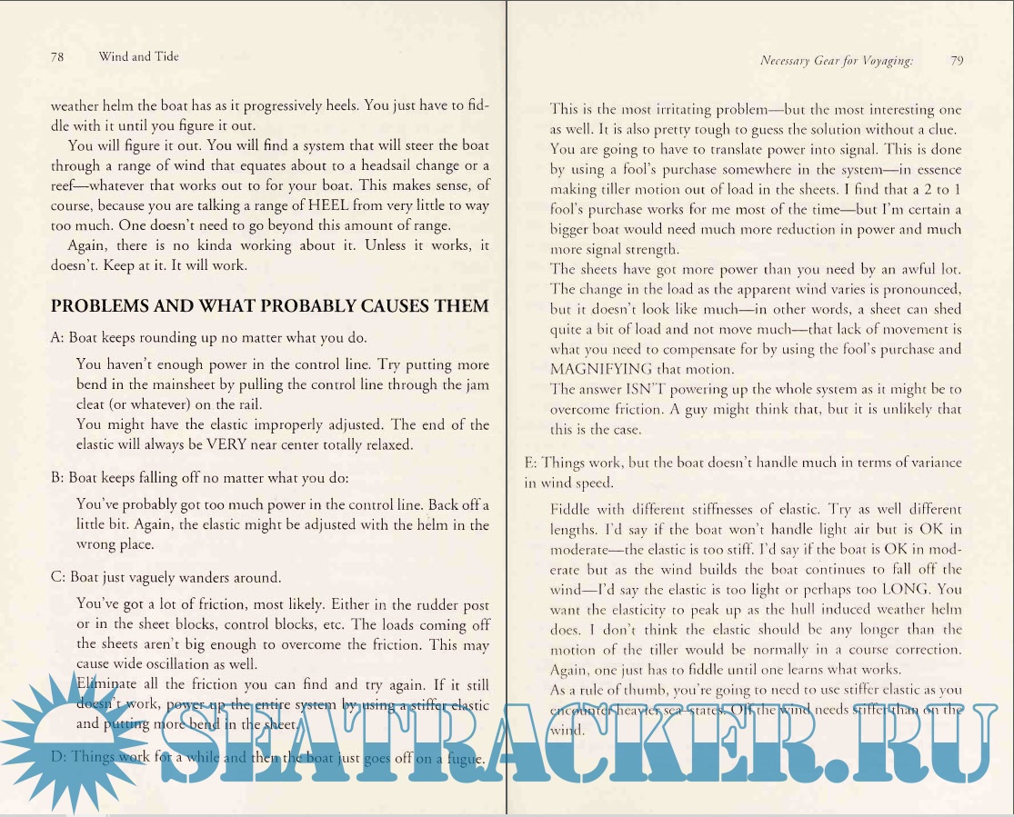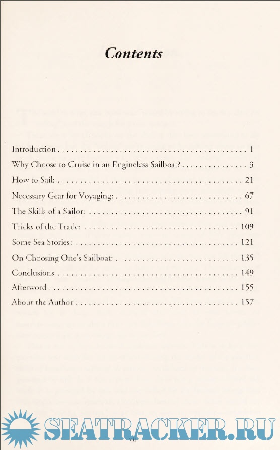 Year: 2002 Language: english Author: Jerome FitzGerald Genre: Handbook Publisher: iUniverse Edition: First ISBN: : 0-595-21733-8 Format: PDF Quality: Scanned pages Pages count: 169 Description: In 169 pages, Mr. Fitzgerald makes a very convincing argument that not only are engines on sailboats harmful to the environment, but engines take away the skill and quiet joy of sailing. Fitzgerald starts with a wonderfully idiosyncratic review of his own philosophy about life and sailing. He comes across as a fairly thoughtful environmentalist. When he discusses boats, he affirms that using an engine is not a benign process. "Make no mistake about it - diesel engines are terrible polluters." His style is quite direct. Fitzgerald writes thoughts that many sailors have pondered, but never said to our colleagues who rely on engines. "While one might forgive a fool, it is difficult to forgive a man who will anchor tucked close to shore in a pristine harbor and pump oil impregnated water overboard in order to run his refrigerator." After laying out a philosophical framework for sailing without an engine, Fitzgerald goes on to give practical advice. He presents interesting sections on sail trim, man overboard drills, boat handling at the dock, types of clouds, light air sailing, oars, self-steering gear, anchoring under sail, knots, and even the Beaufort scale. He doesn't try to provide an all-inclusive tome about sailing technique, but rather a series of practical pointers for those who chose to move across the waters in a boat with no engine. In summary, this book is interesting on several levels. It is both a philosophical treatise on independence from the over materialistic world in which we live, as well as a manual of practical advice about sailing. On all these levels, the book was a delight.