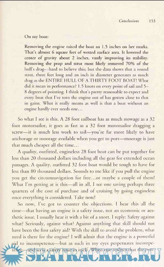 Fitzgerald starts with a wonderfully idiosyncratic review of his own philosophy about life and sailing. He comes across as a fairly thoughtful environmentalist. When he discusses boats, he affirms that using an engine is not a benign process. "Make no mistake about it - diesel engines are terrible polluters." His style is quite direct.