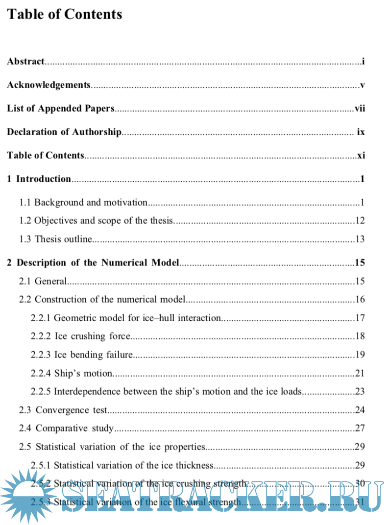 The present thesis focuses on a numerical model for simulating ice–hull interaction and ship maneuvers in level ice. This model is partly based on the empirical data, by which the observed phenomena of continuous icebreaking can be reproduced. In the simulation of a full-scale icebreaking run, the interdependence between the ice load and the ship’s motion is considered, and the three degree-of-freedom (DOF) rigid body equations of surge, sway and yaw are solved by numerical integration. The thickness and strength properties of the ice encountered by the ship are assumed to be constant or predefined based on the statistical data. Accordingly the global and local ice loads on ship hulls can be obtained in a deterministic or probabilistic way.