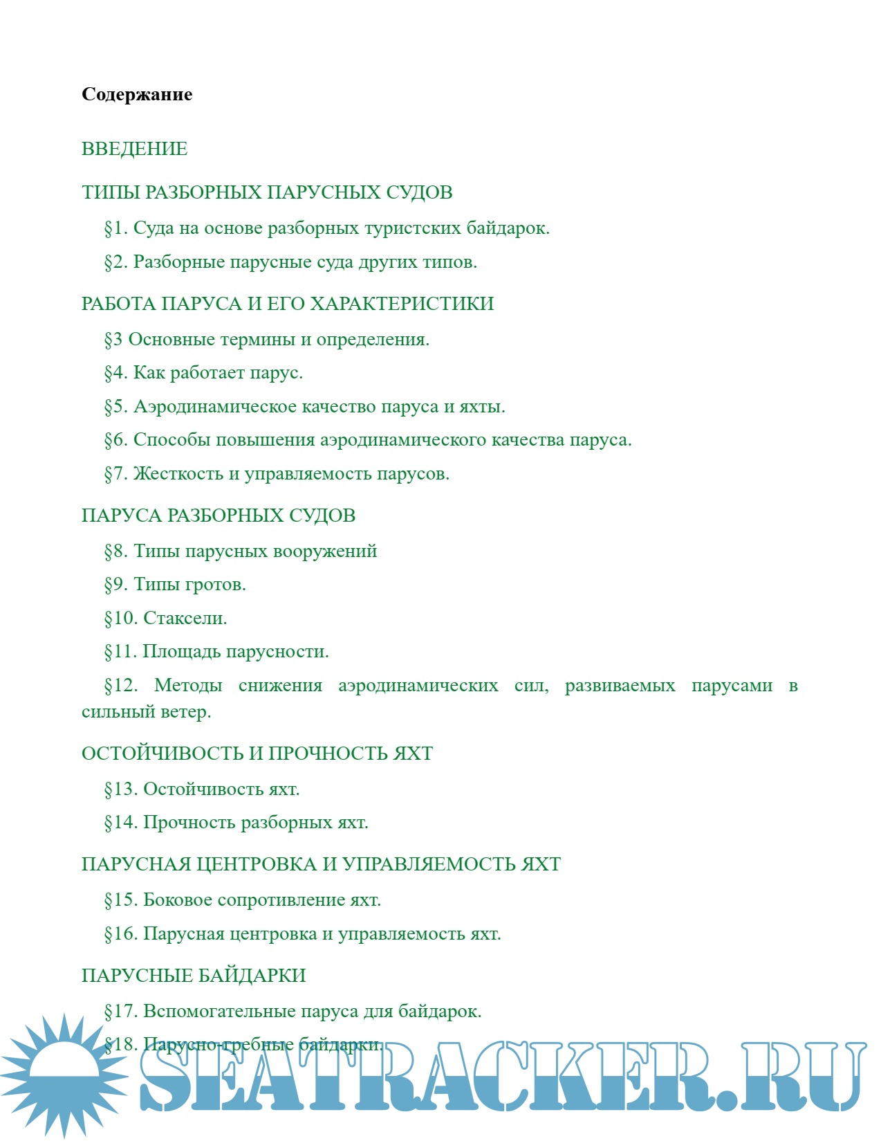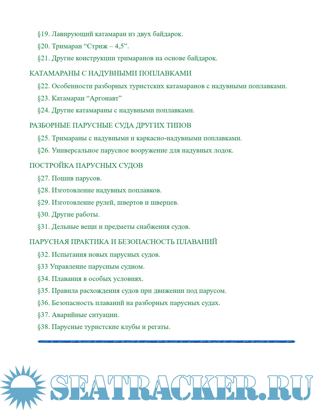Основной раздел книги – описание конструкций парусных судов разных типов для самостоятельной постройки. Конструкции рассмотрены очень подробно, вплоть до приведения рабочих чертежей. Главное внимание автор уделяет наиболее простым и легким судам, которые можно построить дома из доступных материалов. В настоящее время опытные туристы-парусники строят более сложные по устройству суда с использованием современных технологий и дорогих материалов. Это надувные катамараны с парусностью более 10м2. Однако описанные автором простые суда из дешевых материалов остаются более приемлемыми для начинающих туристов-парусников.