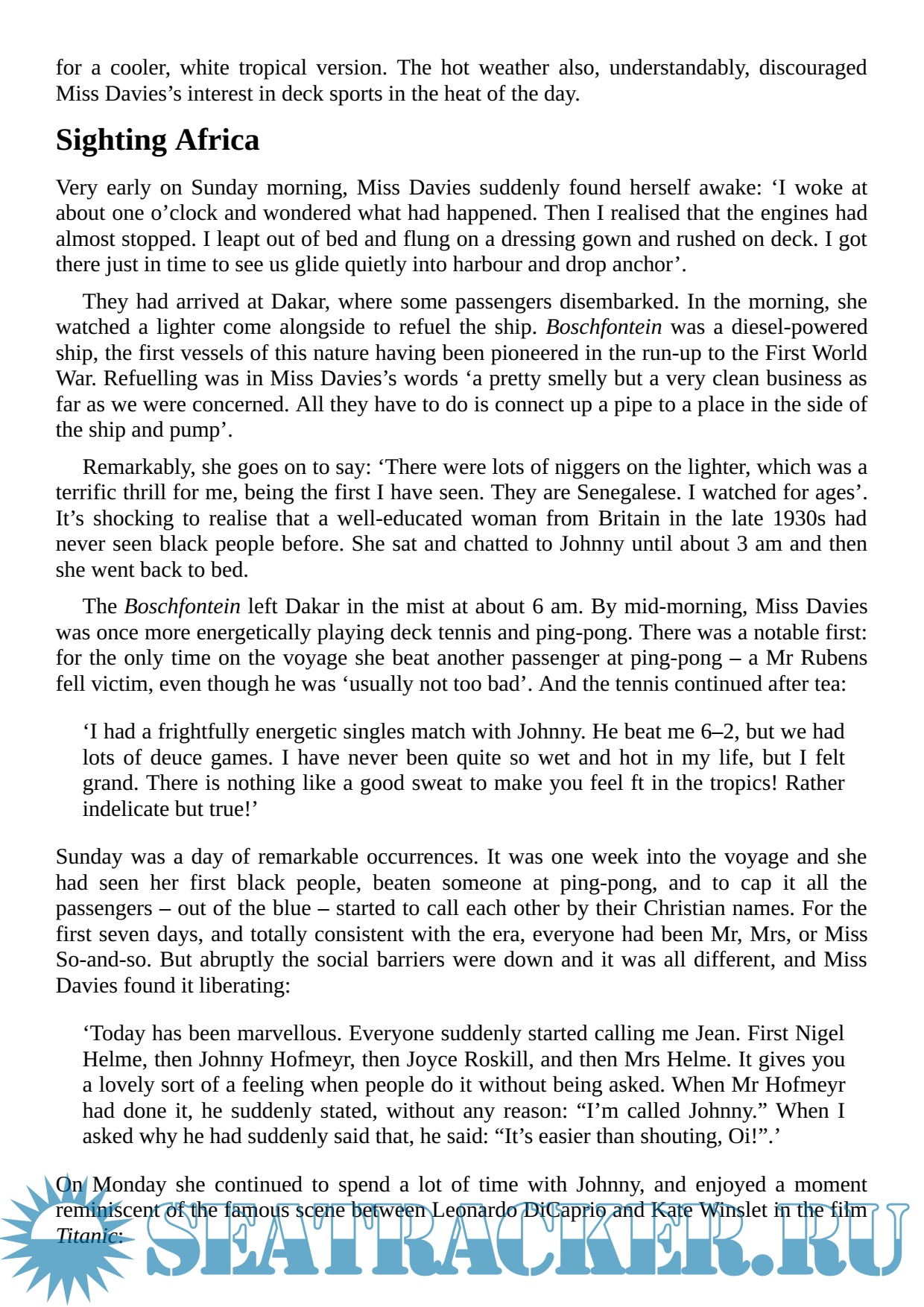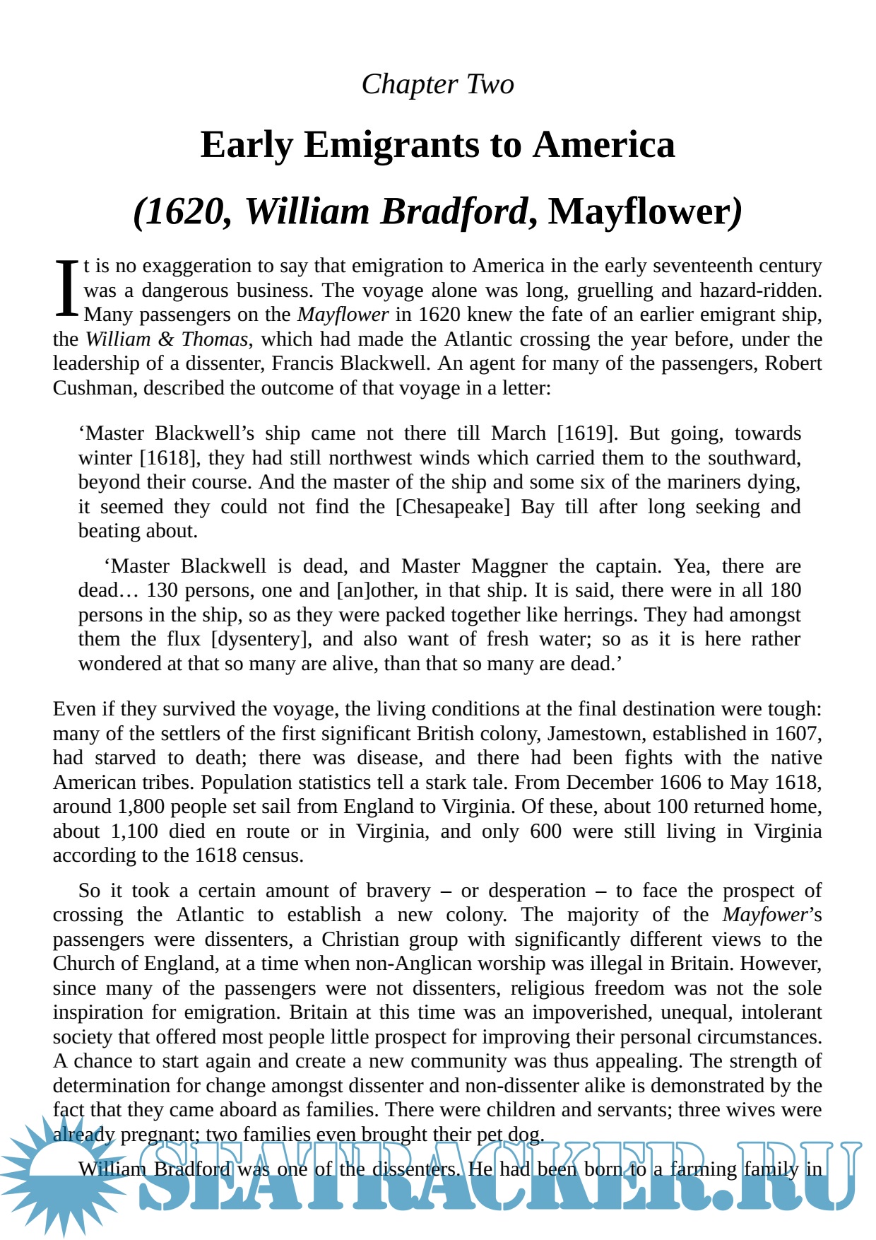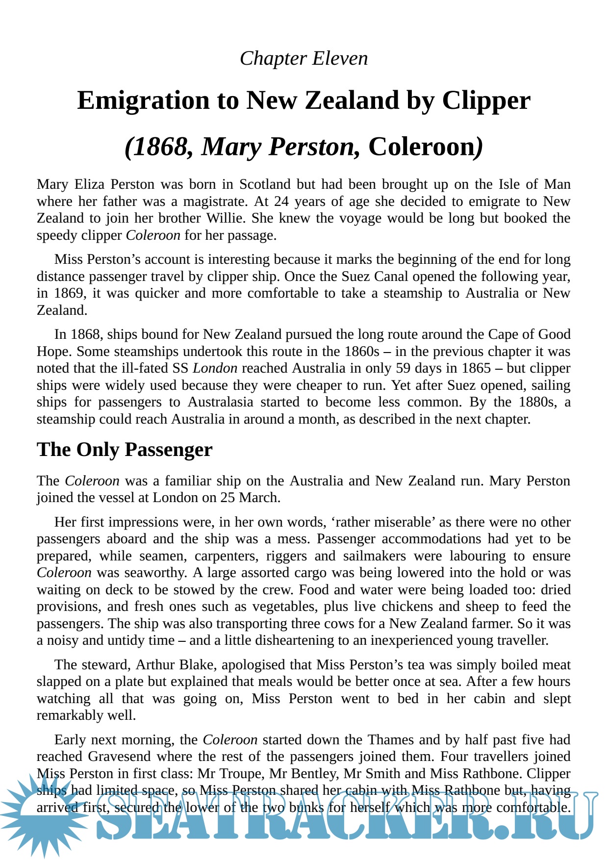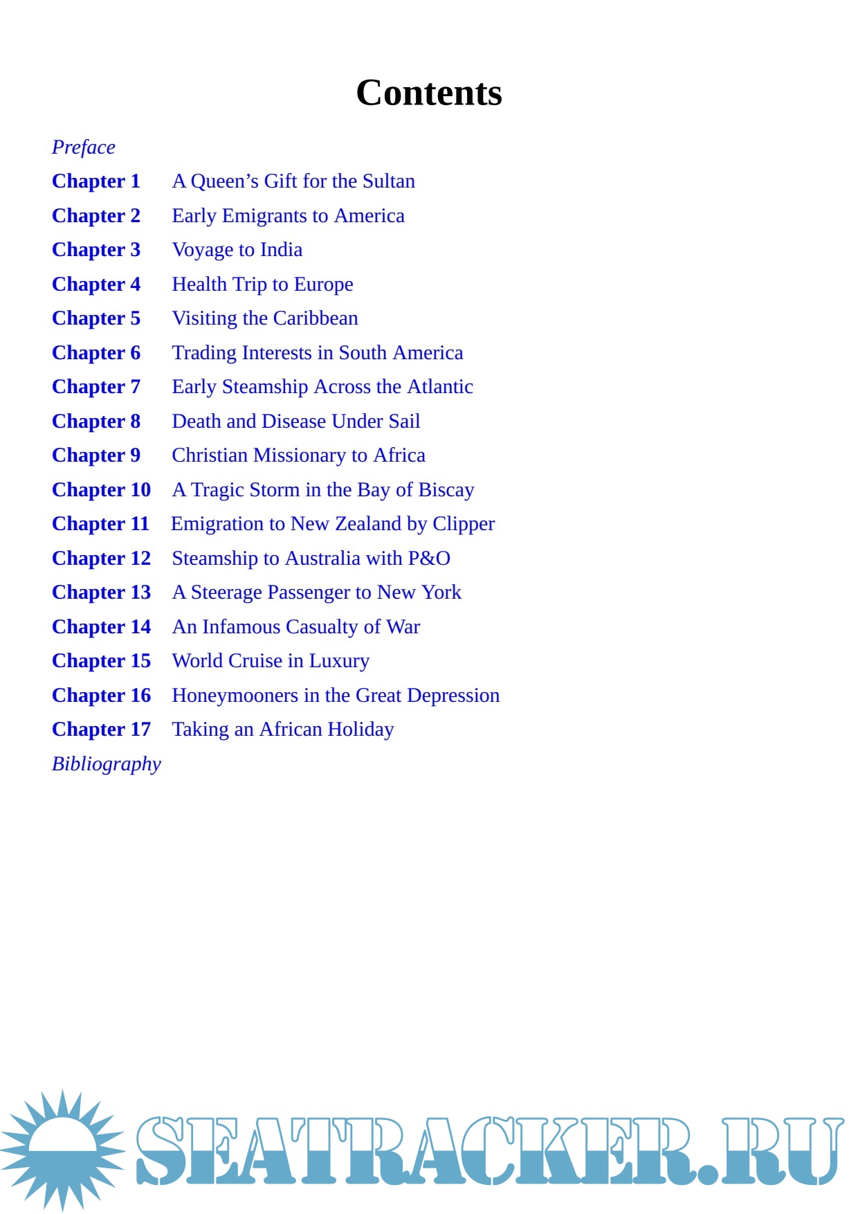 Each chapter focuses on a detailed account of a single voyage from a passenger's perspective, alongside an overview of what sea travel was like in the period. Wills uses their varied experiences to illustrate what life on board ship was like for passengers, from lighthearted stories – the captain who smelled so foul that he put passengers off their food – to darker memories, including those of the man who watched dozens of his fellow travelers die of fever, during one perilous voyage.
