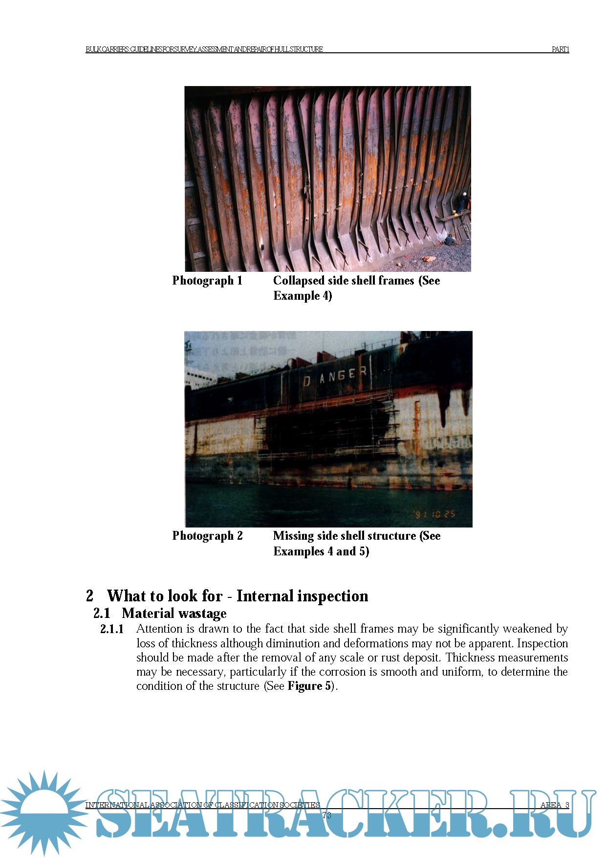 Year: 2007 Language: english Author: IACS Format: PDF Quality: eBook Pages count: 181 Description: These guidelines focus on IACS Member Societies' survey preparation guidelines and concentrate on bulk carrier ships that carry dry cargo, including ore, in bulk. The book provides an outline of survey planning, preparation and execution (including Class requirements and technical background), as well as examples of structural deterioration and damage related to each structural area, demonstrating what to be aware of as well as possible causes and repair methods. Published Date: Corr 1. September 2007