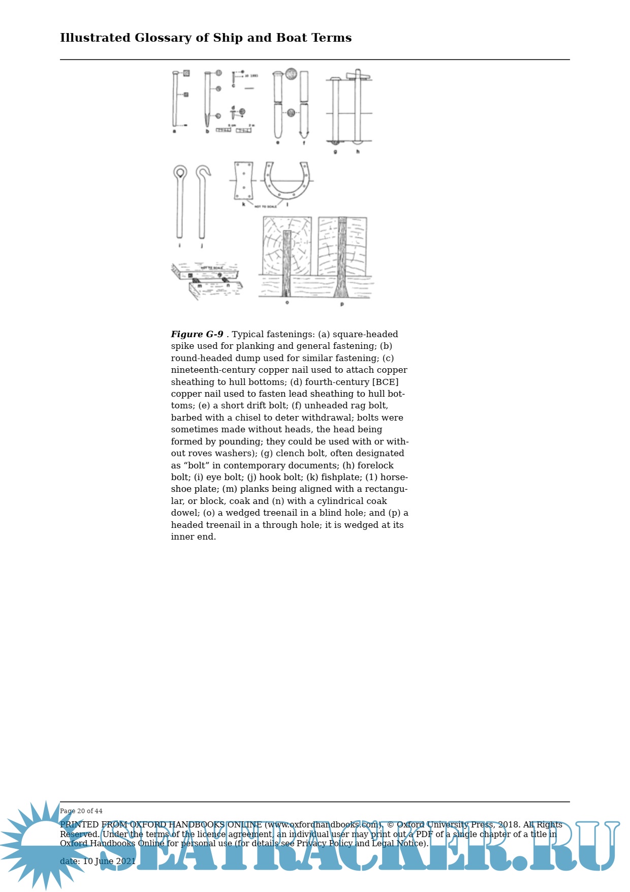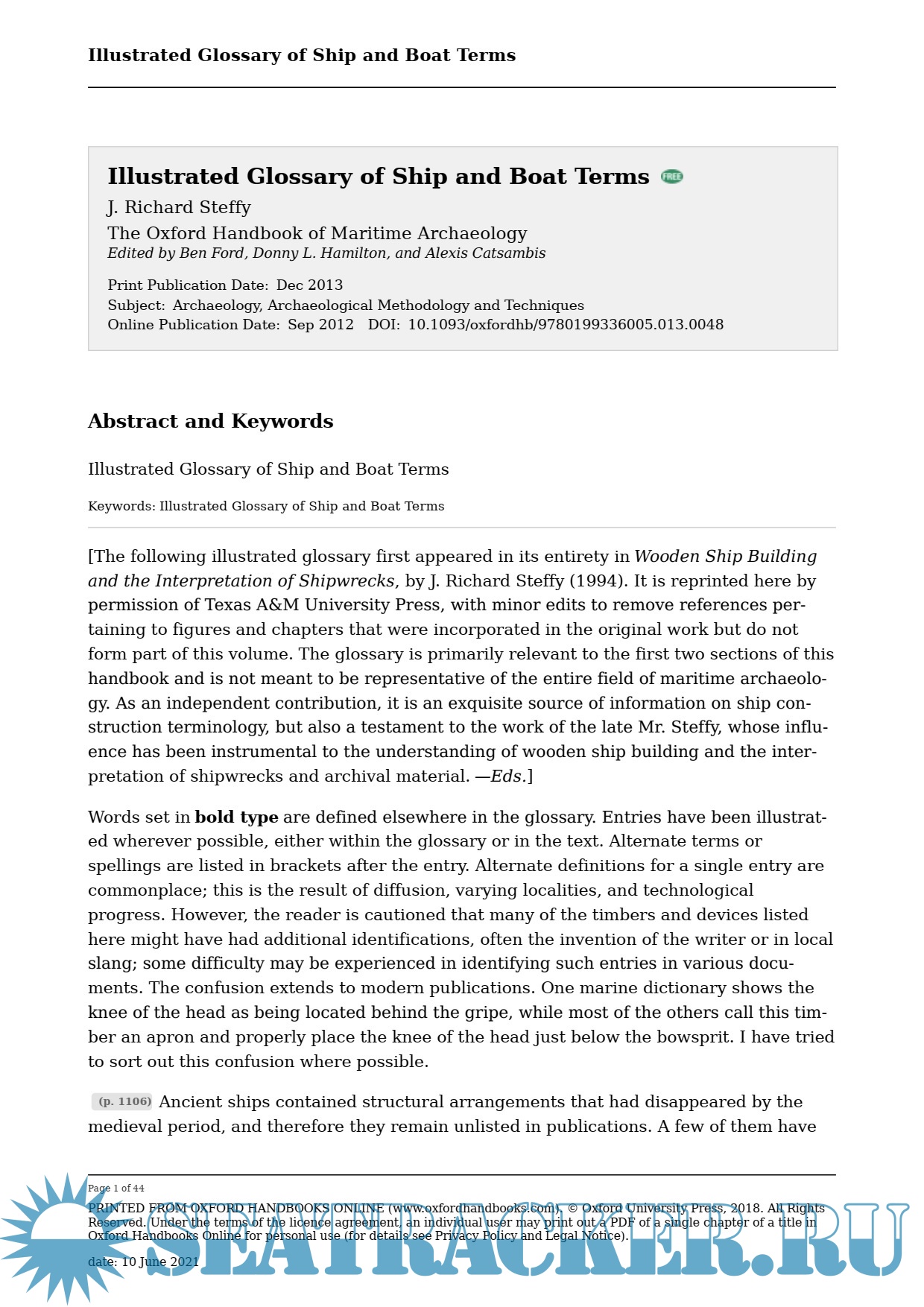 Year: 2013 Language: english Author: Steffy J.R. Genre: Dictionary Publisher: The Oxford Handbook of Maritime Archaeology Format: PDF/DOC Quality: eBook Pages count: 44 Description: Words set in bold type are defined elsewhere in the glossary. Entries have been illustrated wherever possible, either within the glossary or in the text. Alternate terms or spellings are listed in brackets after the entry. Alternate definitions for a single entry are commonplace; this is the result of diffusion, varying localities, and technological progress. However, the reader is cautioned that many of the timbers and devices listed here might have had additional identifications, often the invention of the writer or in local slang; some difficulty may be experienced in identifying such entries in various documents. The confusion extends to modern publications. One marine dictionary shows the knee of the head as being located behind the gripe, while most of the others call this timber an apron and properly place the knee of the head just below the bowsprit. I have tried to sort out this confusion where possible. One more word of caution. Many of the illustrations in the glossary are composite drawings, in some cases including features of several vessels or vessel types in the same drawing. Unless otherwise stated, these illustrations are not intended to represent construction details of specific watercraft.