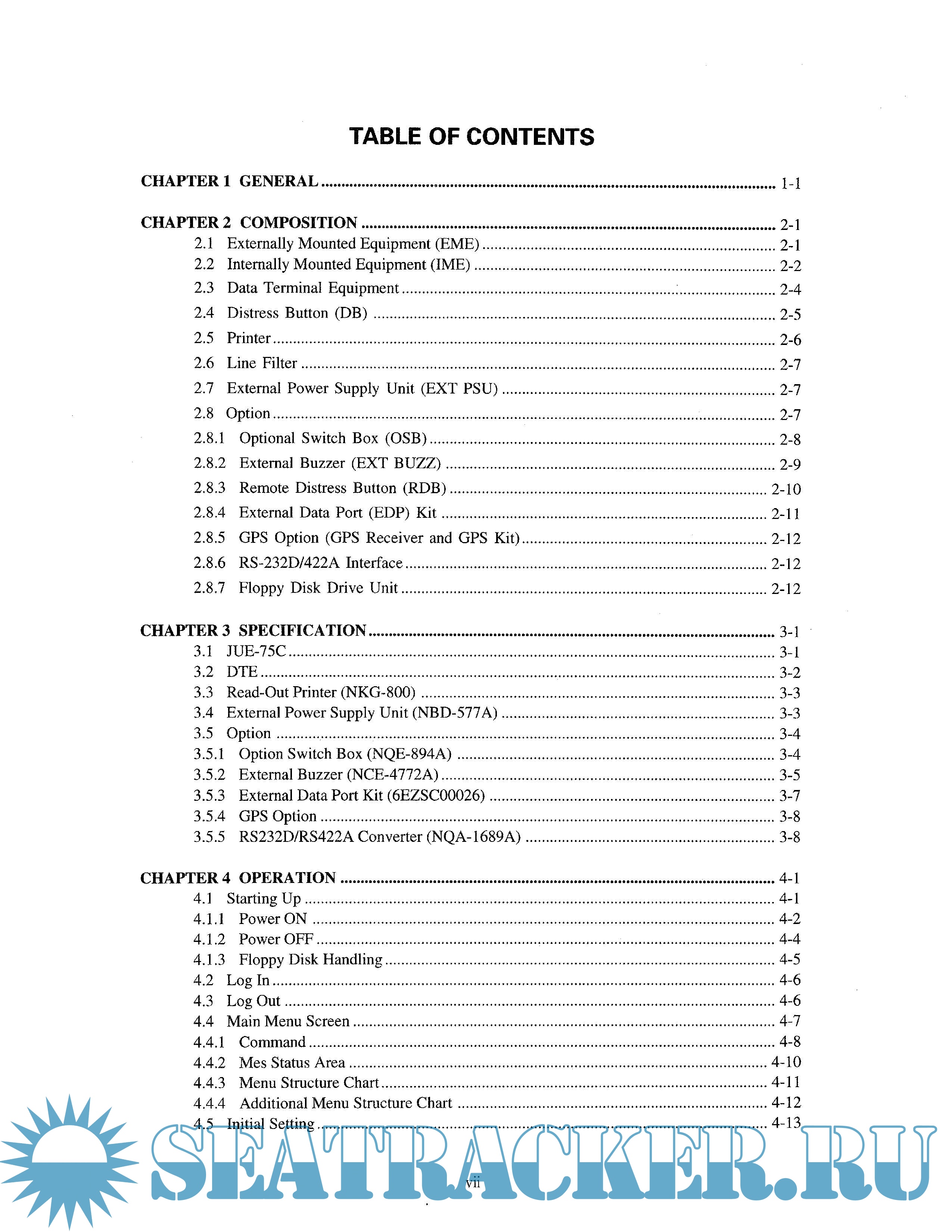 Year: 2003 Language: english Author: JRC Genre: Manual Publisher: JRC Edition: 02 Format: PDF Quality: Scanned pages Pages count: 168 Description: This manual covers the installation, operation and maintenance of the Mobile Earth Station (MES) JUE-75C for Inmarsat-C satellite communications. The Inmarsat-C satellite communications provides text and data transmission to and from Inmarsat-C MES and terrestrial subscribers via a variety of public networks. It also carries the Enhanced Group Call (EGC) message. • Function of JUE-75C JUE-75C provides the following functions; a) Store and Forward message transfer b) Distress Alert c) EGC message reception when not engaged in Inmarsat-C traffic (Inmarsat-C Class 2) d) Position and/or file transfer by a polling command from shore using store and forward message transfer e) Scheduled position and/or file transfer using store and forward message transfer f) Position and/or data reporting using data reporting protocol specified by Inmarsat (depends on LES facility)