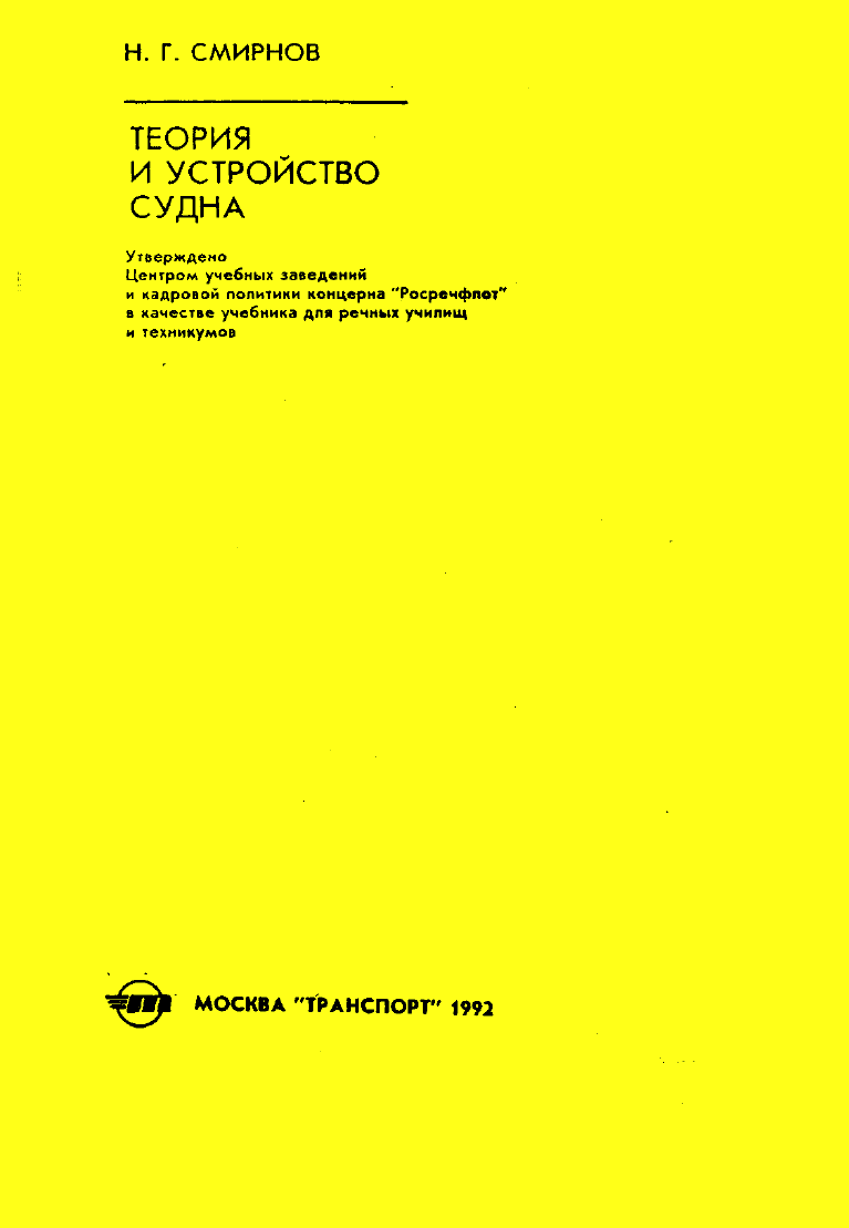 Теория и устройство судна Год выпуска: 1992 Язык: русский Автор: Смирнов Н.Г. Жанр: Теория устройства судна Издательство: Транспорт Формат: PDF Качество: Отсканированные страницы Описание: Даны доступные понятия о навигационных и эксплуатационных качествах судна: плавучести, остойчивости, непотопляемости, качке, управлении судном.Изложены вопросы статики и динамики. Приведены конструктивные особенности металлических, железобетонных и композитных судов, судовых устройств и систем. Дано представление о проектировании и постройке судов.