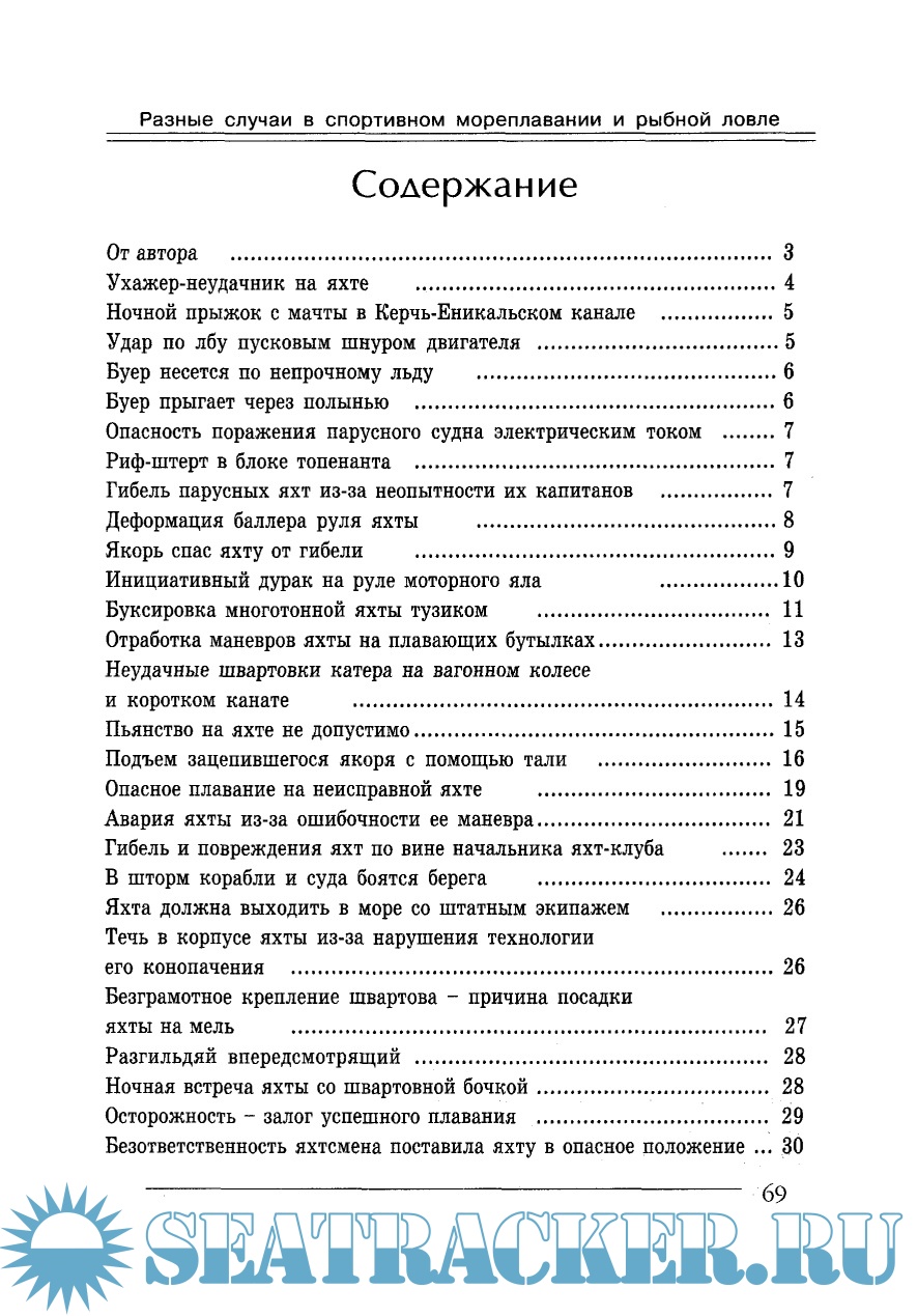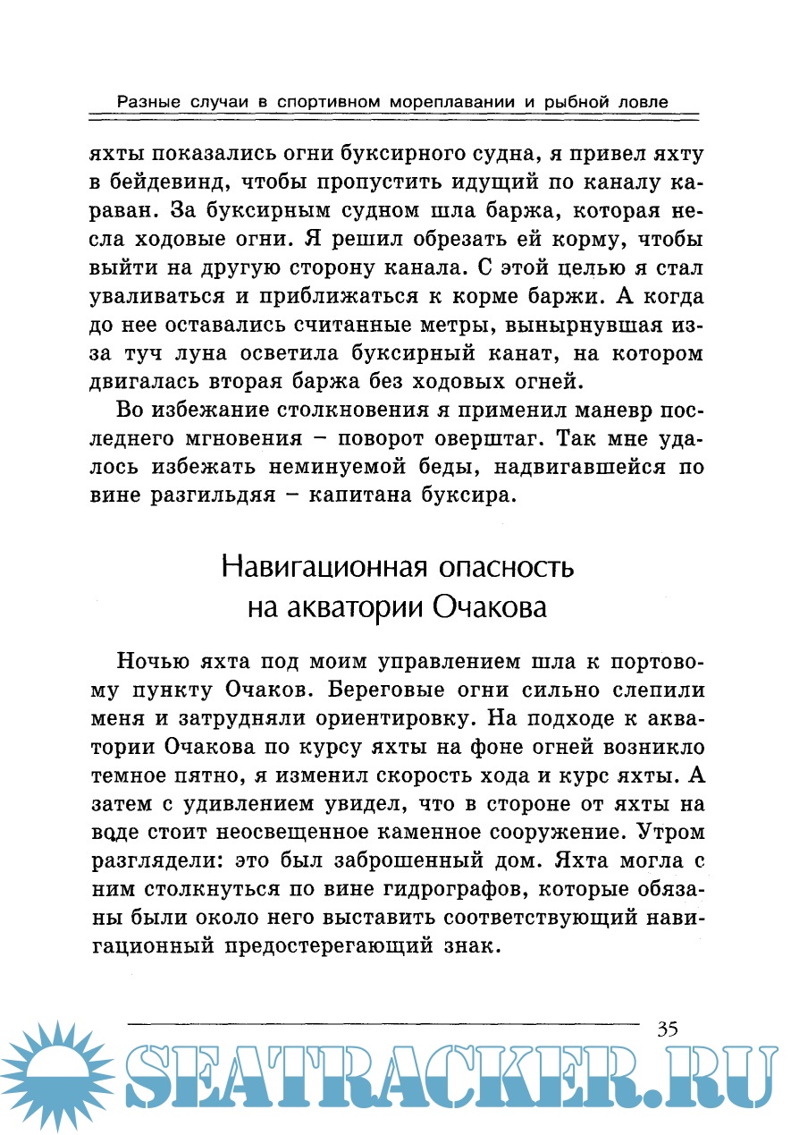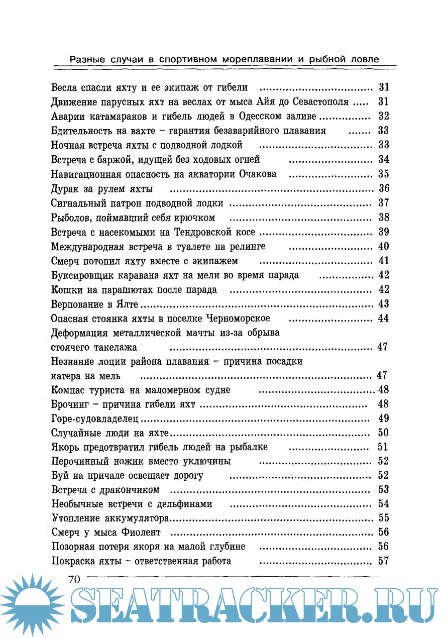 Описание: За много лет занятий яхтингом и любительской рыбной ловлей автору довелось стать свидетелем и участником разных забавных, драматических и трагических случаев на море. Возможно, этот опыт поможет любителям паруса и рыбной ловли избежать ошибок и улучшить свой морской опыт. Ночной прыжок с мачты. Буер. Поражение парусного судна электрическим током. Гибель парусных яхт. Инициативный дурак. Пьянство на яхте. В шторм. Осторожность - залог успешного плавания. Разгильдяй. Безответственность. Гибель людей в Одесском заливе. Ночная встреча с подводной лодкой. Бдительность на вахте. Международная встреча на релинге. Смерч. Брочинг - причина гибели яхт. Встречи с дельфинами. Спасательный плот. Коварное Азовское море.