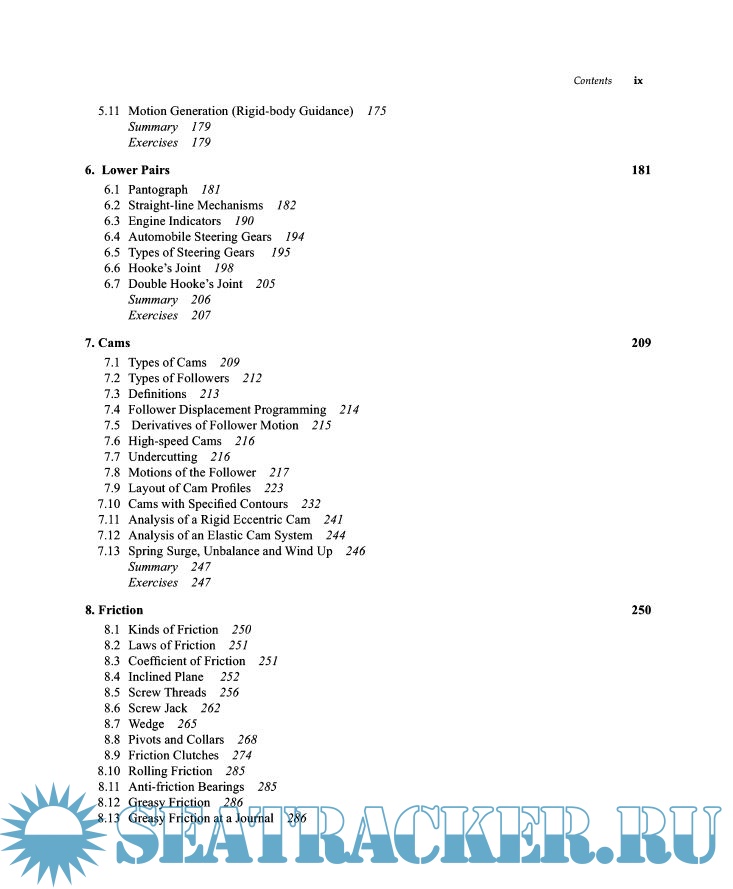 Year: 2009 Language: english Author: S. S. Rattan Publisher: Tata McGraw Hill Edition: 3rd ISBN: 978-0-07-014477-4 Format: PDF Quality: OCR with errors Pages count: 732 Description: The ‘Theory of Machines’ by S. S. Rattan is a book that is designed for the students pursuing undergraduate degree across various engineering courses. The syllabus of the book includes an in-depth analysis on Kinematics and the Dynamics of Machinery. The book features the recent advancements and developments on the new mechanisms and explains the underlying principles of kinematics. The book has a credible practice section to help the students test their understanding of the chapters. The questions are based on theoretical concepts. The examples and illustrations have been explained well along with well labeled diagrams to ease the understanding quotient of the student.