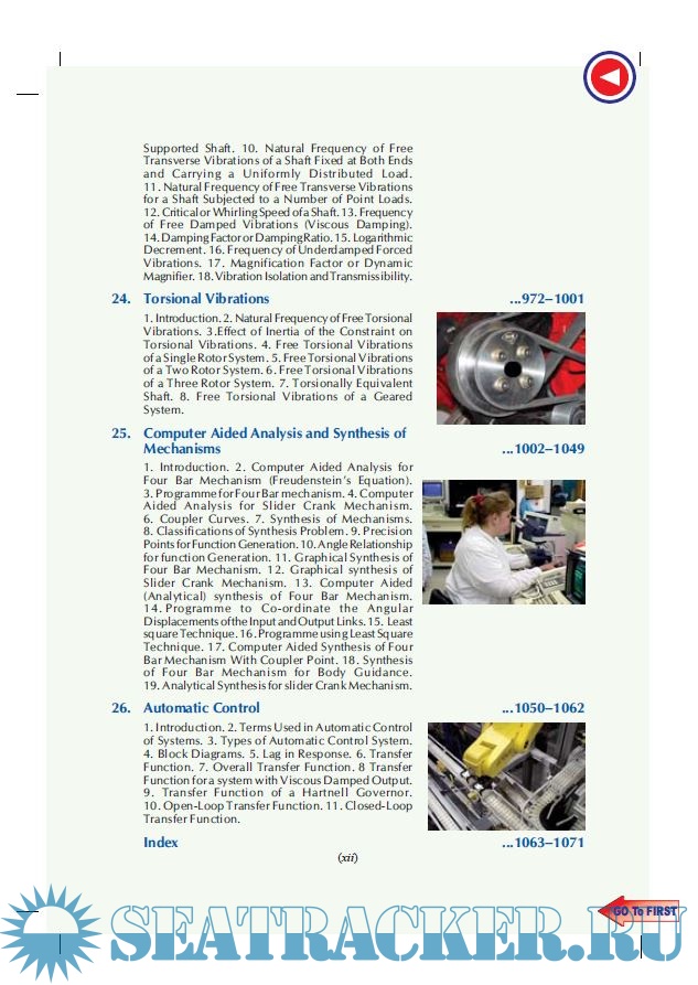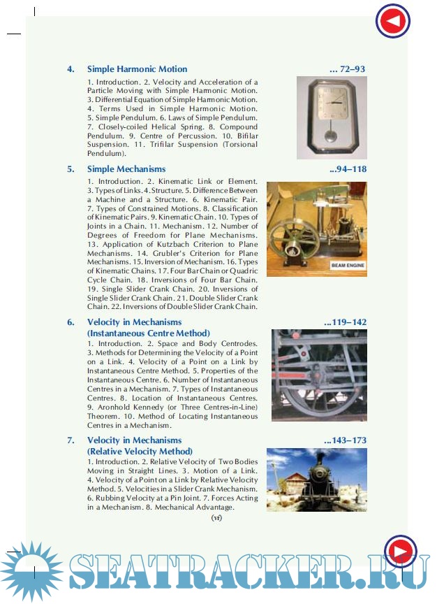 Description: The book begins with an introduction to the subject. This is followed by chapters on kinetics and kinematics of motion, velocity and acceleration in mechanisms, friction, gear trains, toothed gearing, dynamo-meters and brakes. Chapters on concepts like cams, rotating and reciprocating masses, transverse and longitudinal vibrations, torsional vibrations, and automatic control are also included in the book. A separate chapter is dedicated to computer-aided analysis and synthesis of mechanisms.
