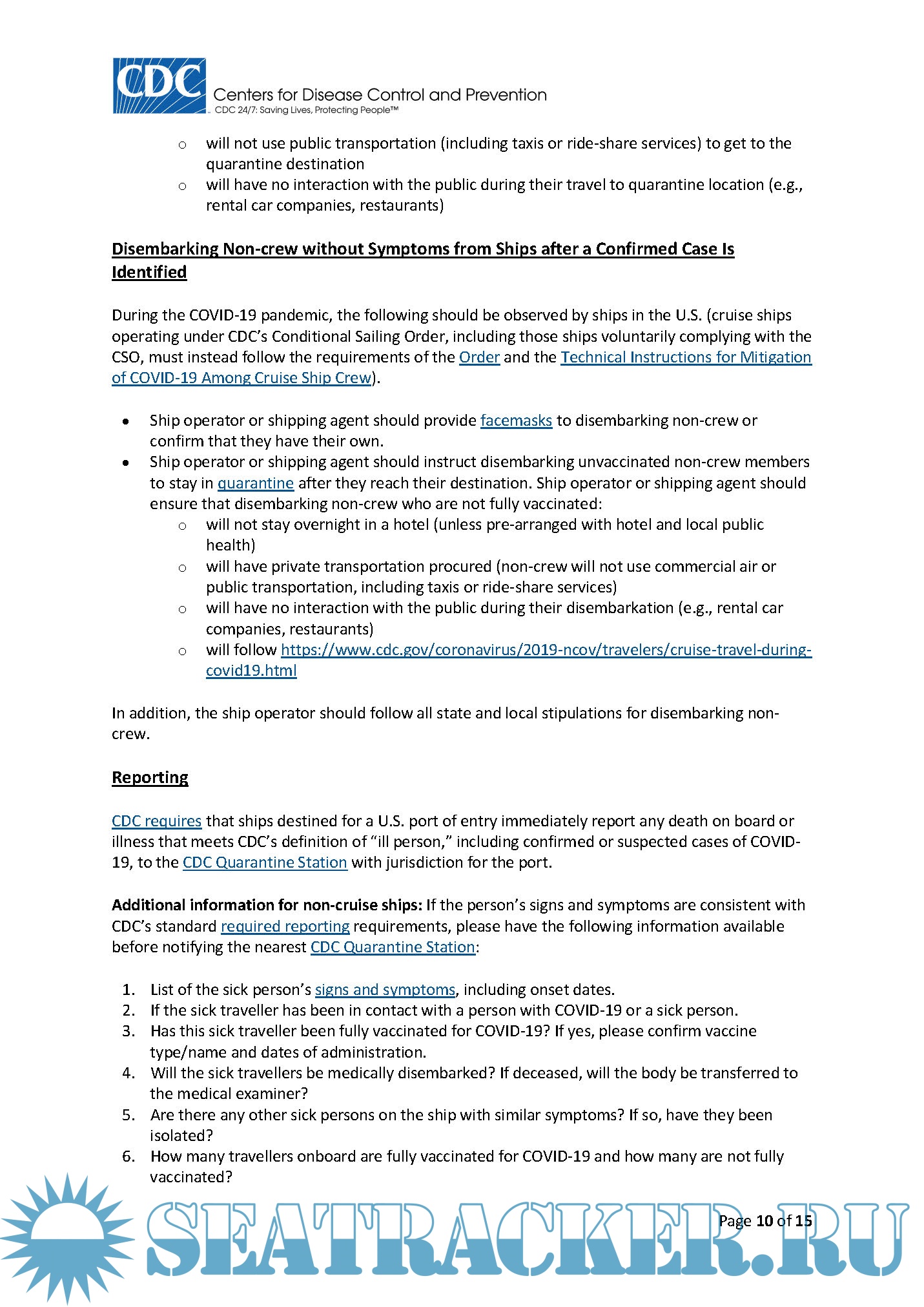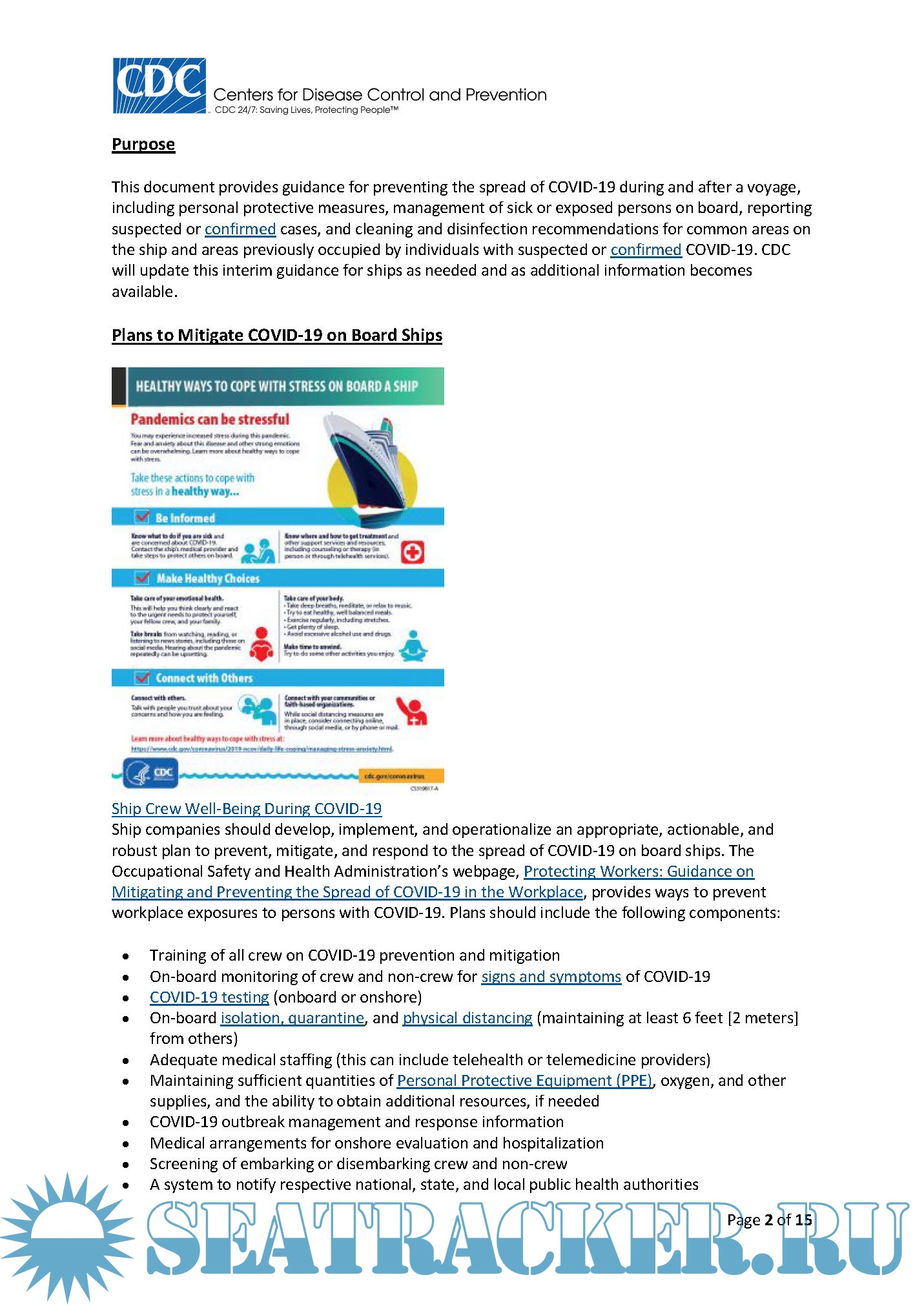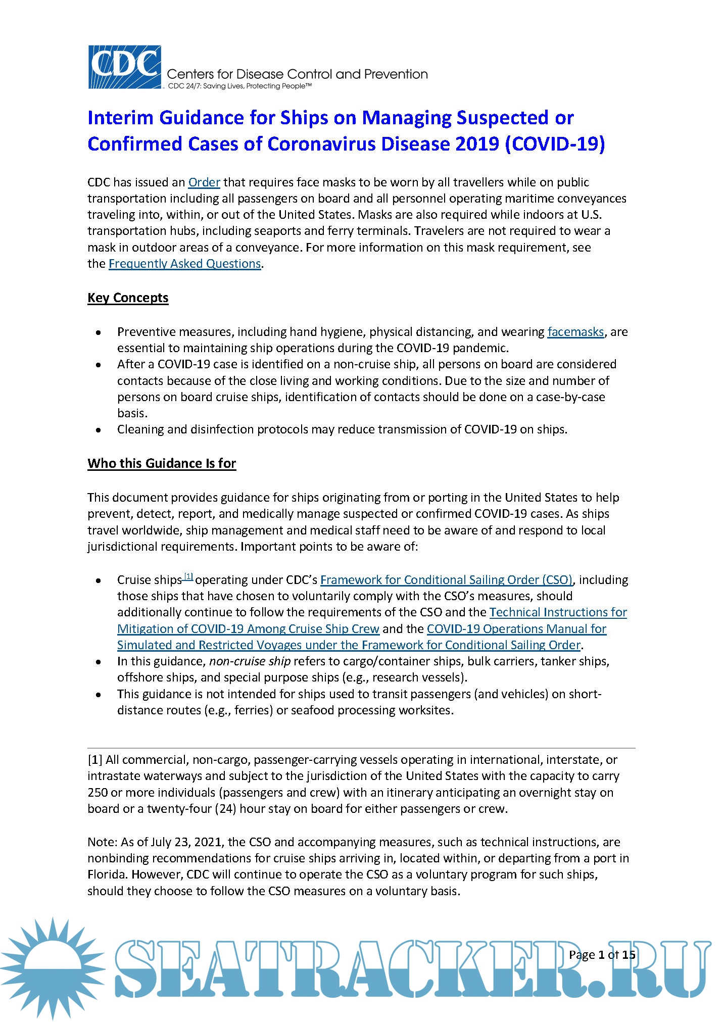 Year: 2021 Language: english Author: CDC Format: PDF Quality: eBook Pages count: 15 Description: The US Center for Disease Control (CDC) published new guidance to clarify its recommendations for crewmembers who are fully vaccinated. The guidance pertains to ships originating from or porting in the United States to help prevent, detect, report, and medically manage suspected or confirmed COVID-19 cases. This document provides guidance for preventing the spread of COVID-19 during and after a voyage, including personal protective measures, management of sick or exposed persons on board, reporting suspected or confirmed cases, and cleaning and disinfection recommendations for common areas on the ship and areas previously occupied by individuals with suspected or confirmed COVID-19. CDC will update this interim guidance for ships as needed and as additional information becomes available. Updated as of September, 2021