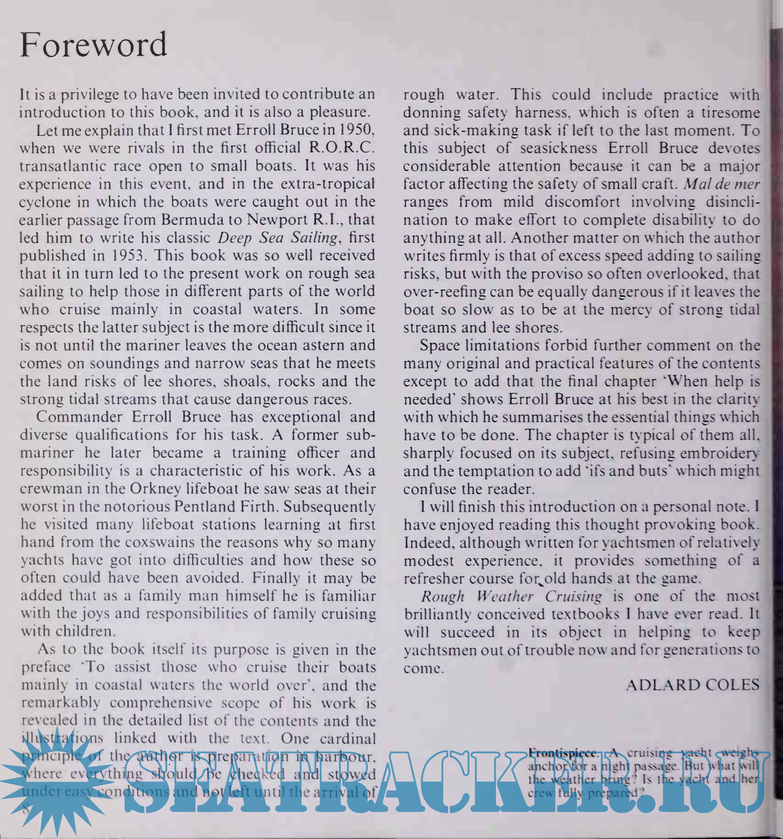 Year: 1980 Language: english Author: Erroll Bruce Genre: Handbook Publisher: SAIL BOOKS, INC. Edition: First ISBN: 0-914814-23-0 Format: PDF + EPUB Quality: Scanned pages Pages count: 142 Description: Good workbook for that bad weather. Read this book on a nice calm day. If you need this book, it's probably too late to read it. In rough weather you are tired, wet, perhaps a little queasy, getting around the boat is dangerous and difficult. Bruce lays out clear and simple strategies for managing yourself and the boat in bad conditions. Having experienced up to force 9 myself I can heartily recommend Bruce as a guide for what to do. You can sail safely in dreadful conditions, as long as you know what you are doing. Additional info: PDF & EPUB