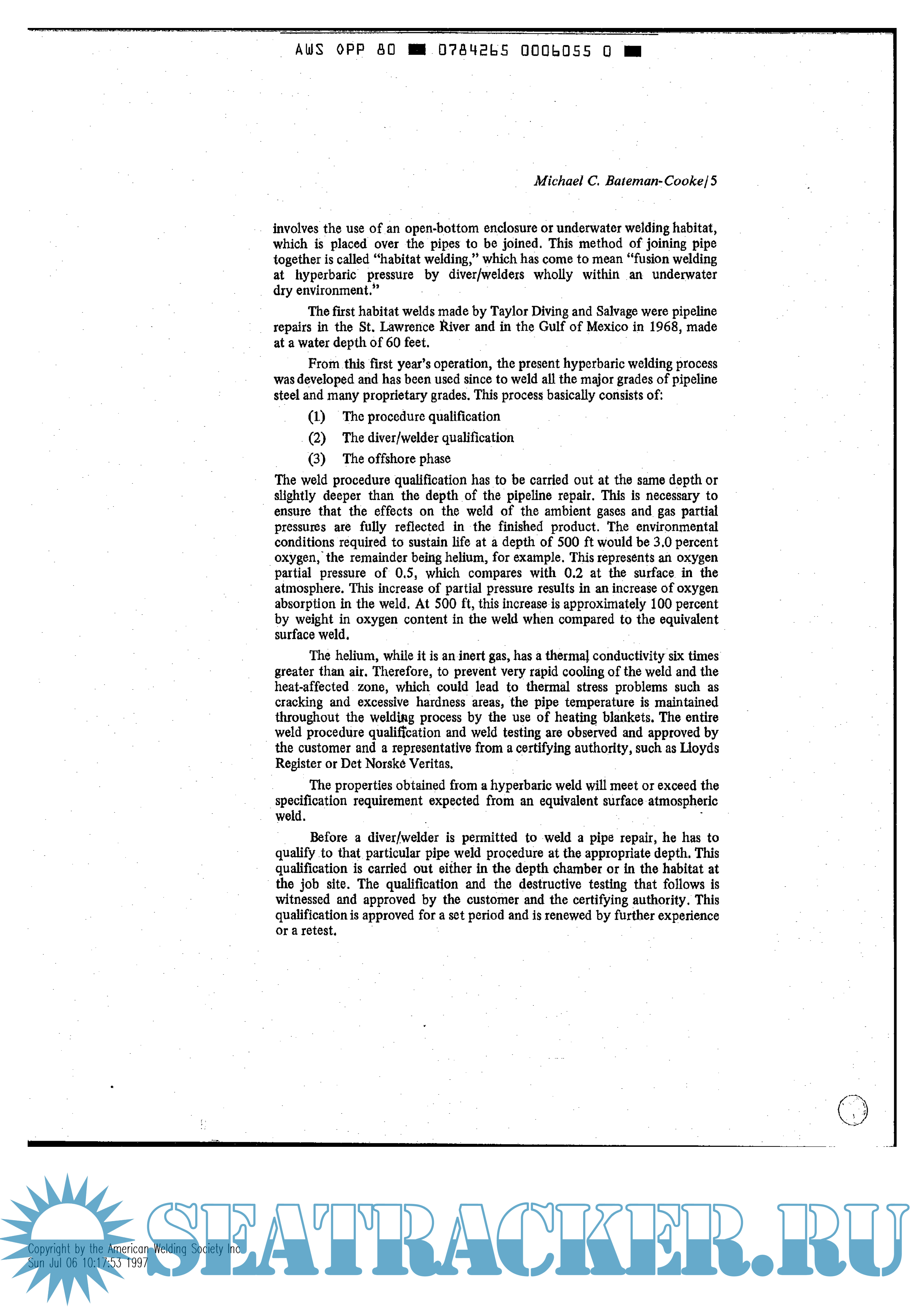 Description: Any professional who has ever participated in the performance of a deepwater hyperbaric weld will certainly agree that the successful welded connection, repair, and attachment of two pieces of steel in a dry environment is still one of maybe the most ambitious and challenging project with which the diving industry of today is confronted. This book is aimed to provide all required technical guidance on various aspects of underwater welding.