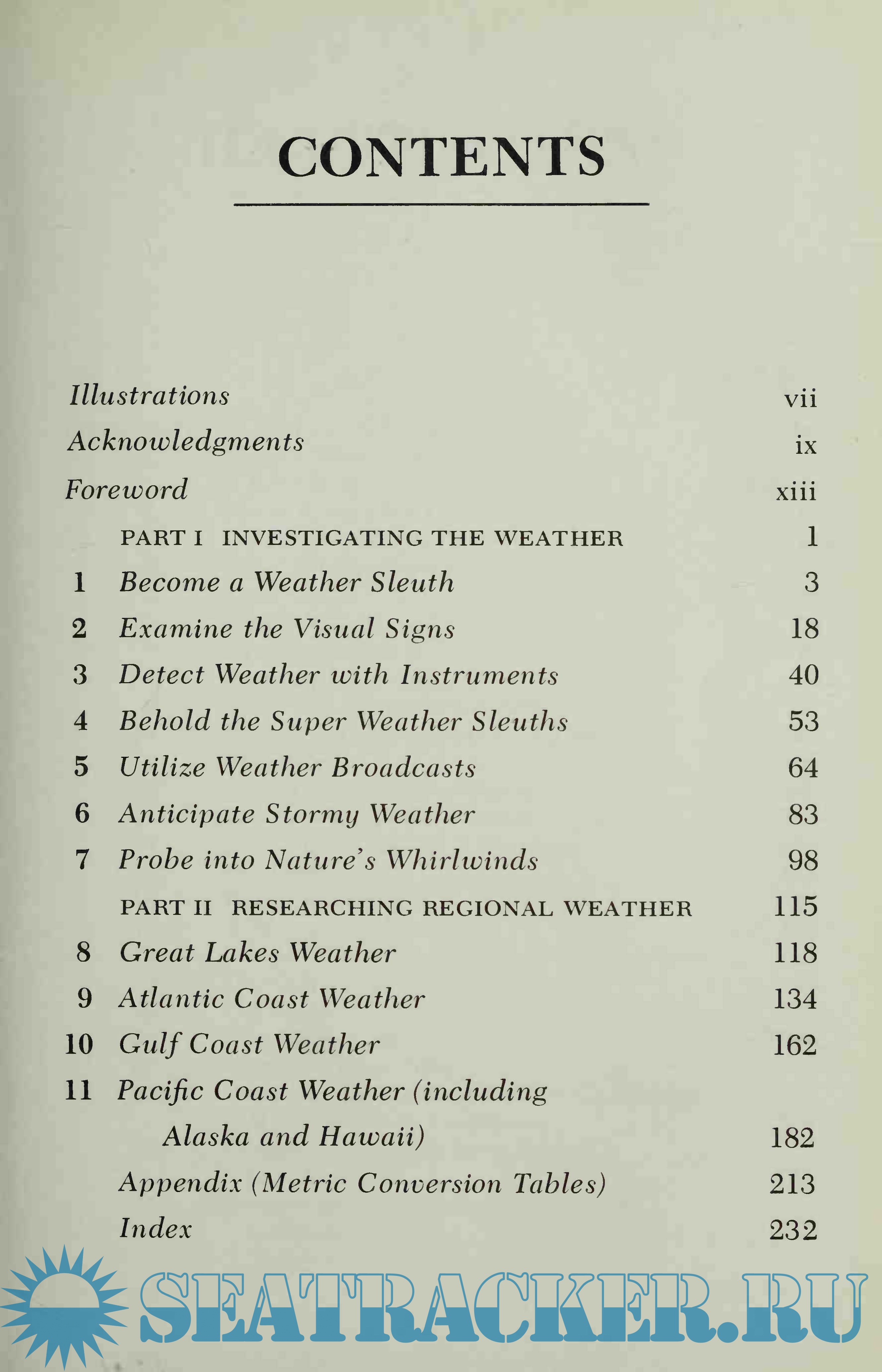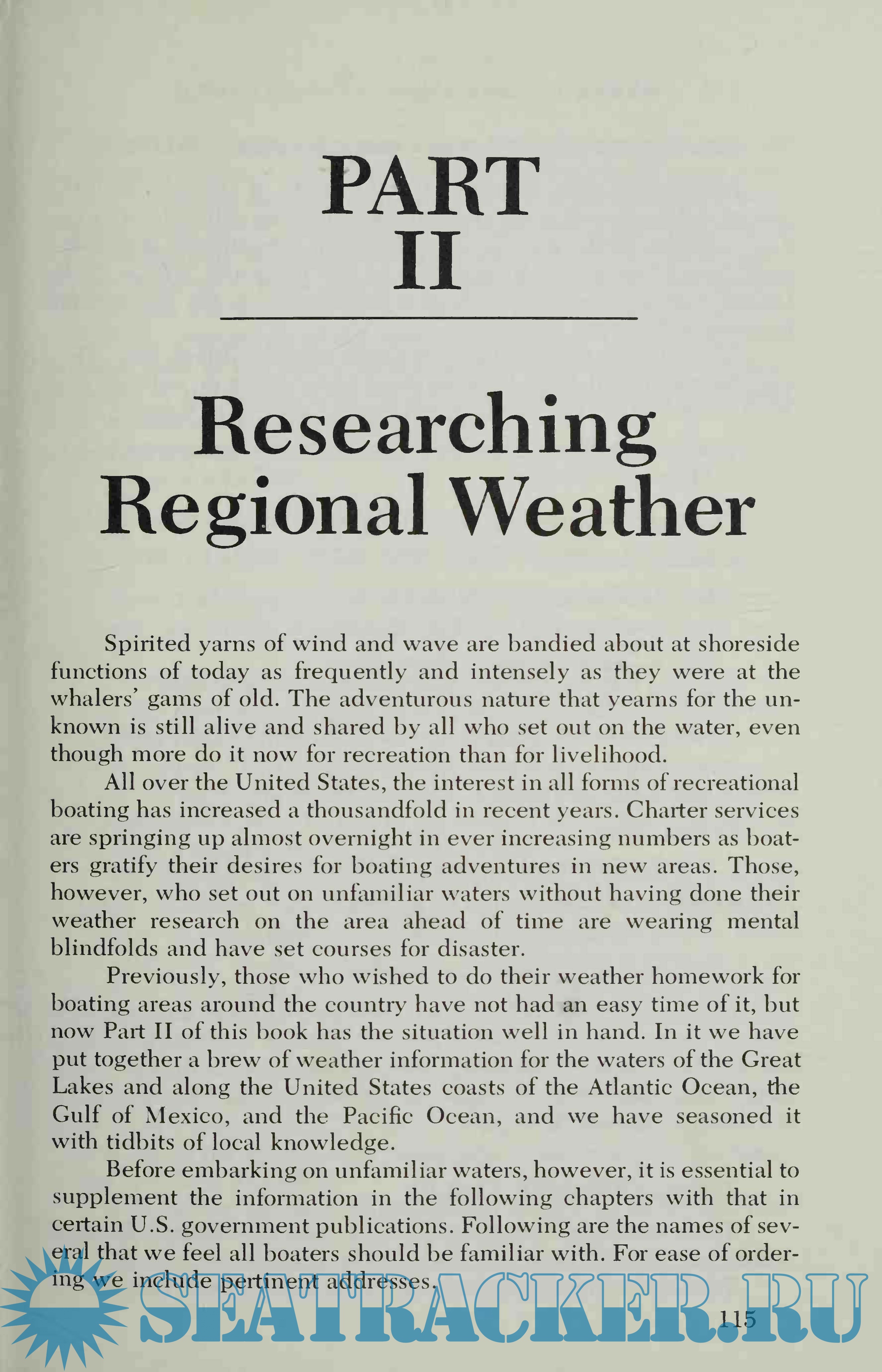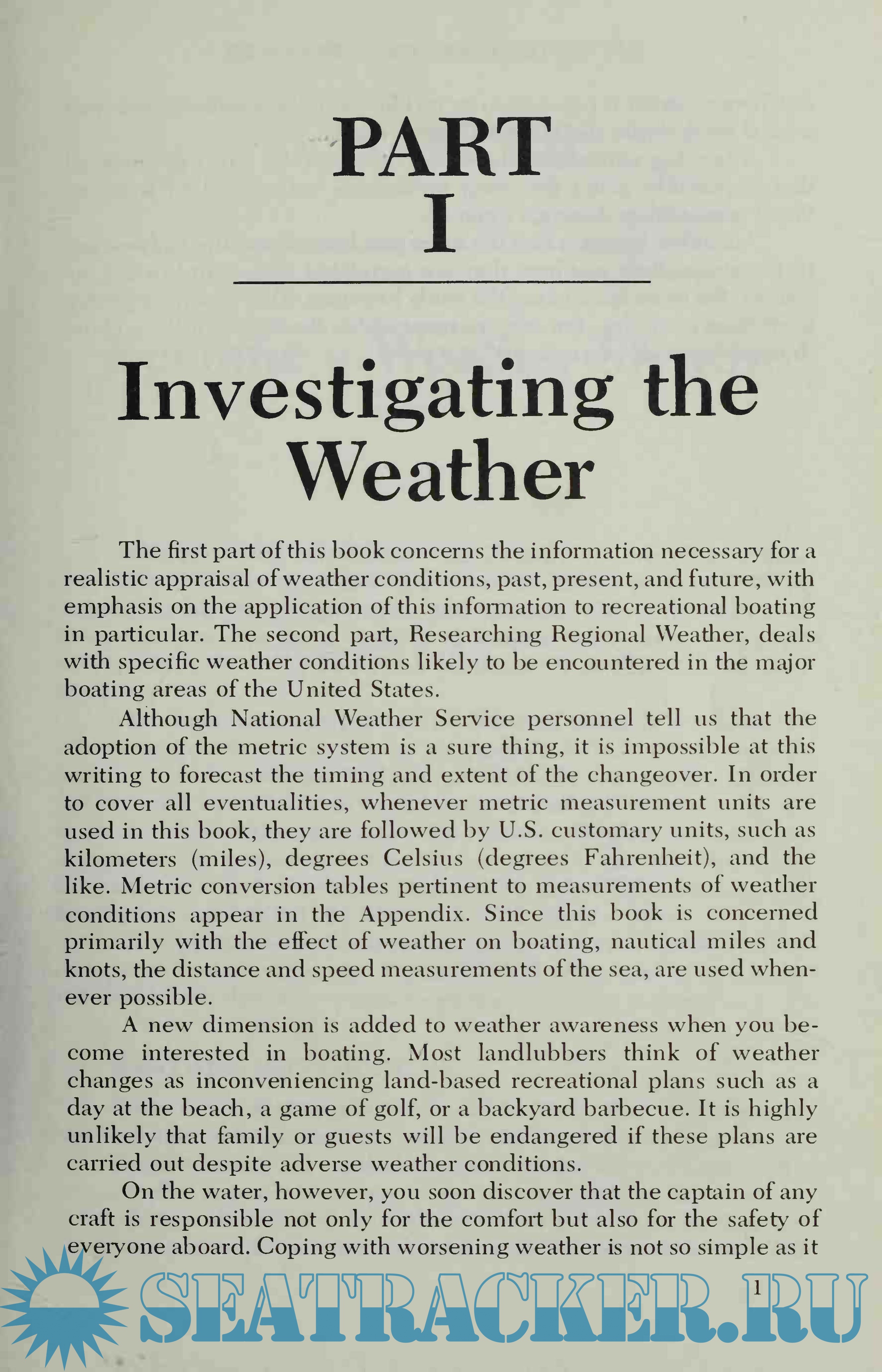 Year: 1978 Language: English Author: Sallie Townsend and Virginia Ericson Genre: Handbook Publisher: DAVID McKAY COMPANY, INC Edition: First ISBN: 0-679-50798-1 Format: PDF & EPUB Quality: Scanned pages Pages count: 262 Description: Vast amounts of weather information from the National Weather service are available to you everyday through various channels (newspapers, radio, television) and through your own observations. But how do you turn all these facts and figures into the answers to your questions: What kind of weather will we have today and tomorrow? What's the prudent way to respond to such conditions? Although the information in this book is intended primarily for boating people, anyone who's curious about what happens in nature will enjoy and be helped by this lively and easily understood book, which is laced with personal anecdotes. Yet for all of its liveliness and ease of comprehension, the information is of utmost scientific soundness. In their extensive research, the authors had the cooperation and encouragement of experts in the National Weather Service, the Army Corps of Engineers, the U.S. Navy, the U.S. Coast Guard, the Federal Communications Commission, and the Federal Aviation Agency. The entire text has been thoroughly reviewed by experts on the covered topics. And the authors' own extensive experience in cruising, racing, and coping with the weather has been supplemented by information they gathered from more than 100 other seasoned boating people in all regions of the country. Here's clear description, with detailed illustrations, of not only the general weather patterns of the United States but also of all four major boating regions: • Atlantic Coast • Gulf Coast • Great Lakes • Pacific Coast (including Alaska and Hawaii) Throughout this text, metric and other international units of measurement are used, and in each instance the equivalent in more familiar terms follows immediately in parenthesis. Additional info: PDF & EPUB