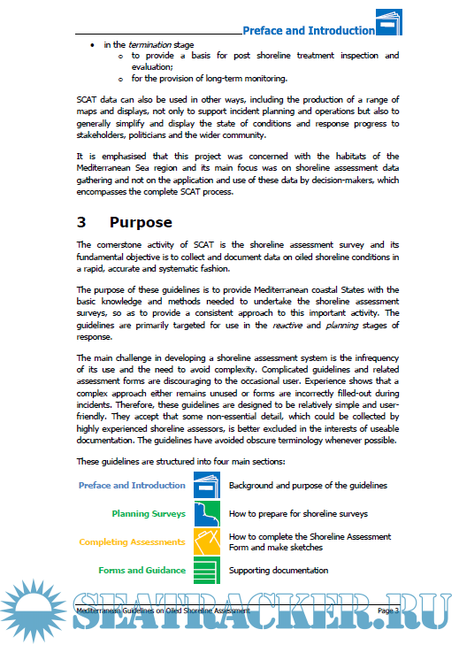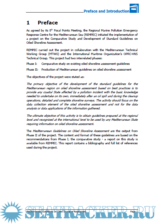 The primary objective of the development of the standard guidelines for the Mediterranean region on oiled shoreline assessment based on best practices is to provide any coastal State affected by a pollution incident with the basic knowledge needed to undertake on its own, immediately after an oil spill and during the cleanup operations, detailed and complete shoreline surveys. The activity should focus on the data collection element of the oiled shoreline assessment and not for the data analysis or data applications of the information gathered.