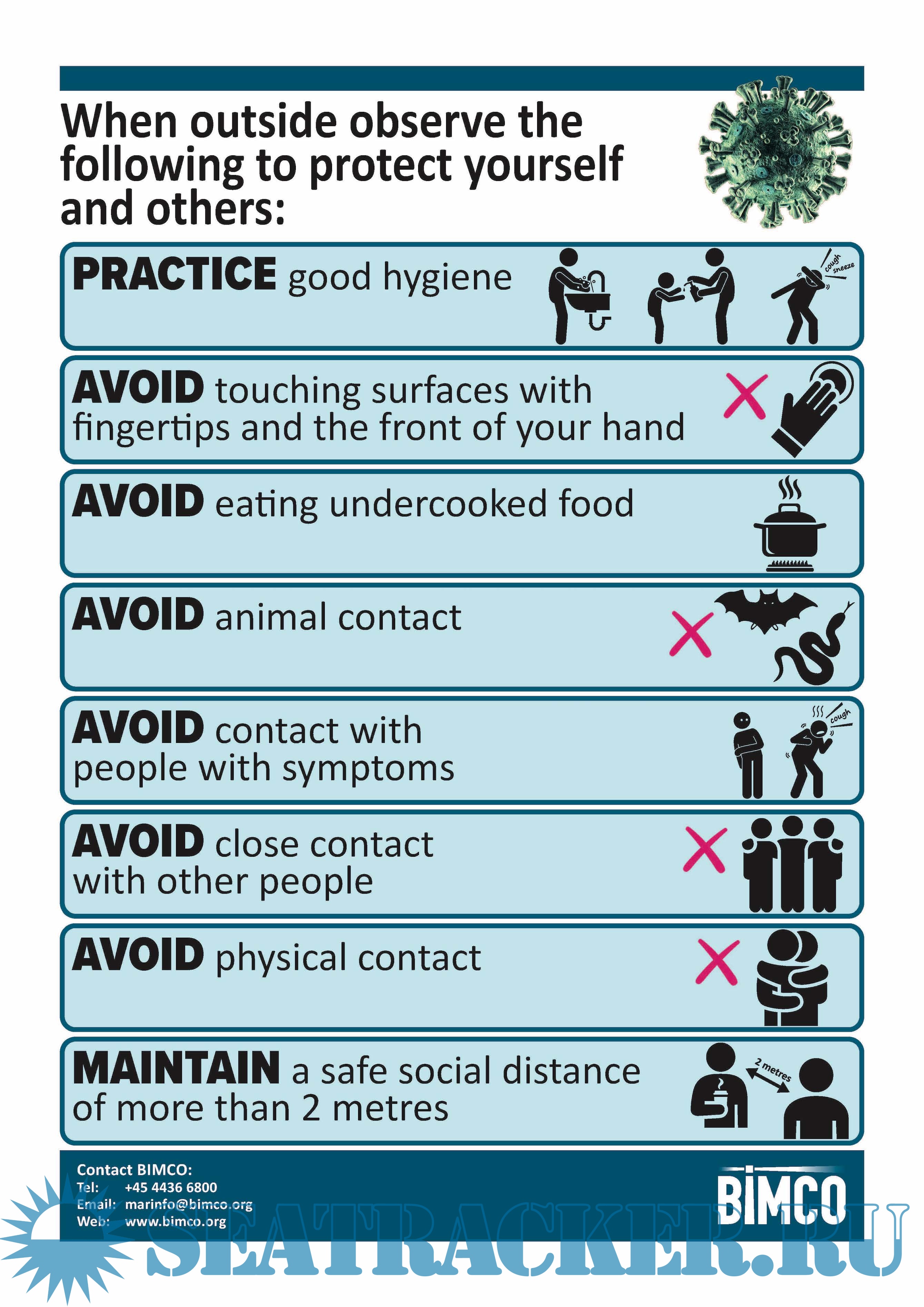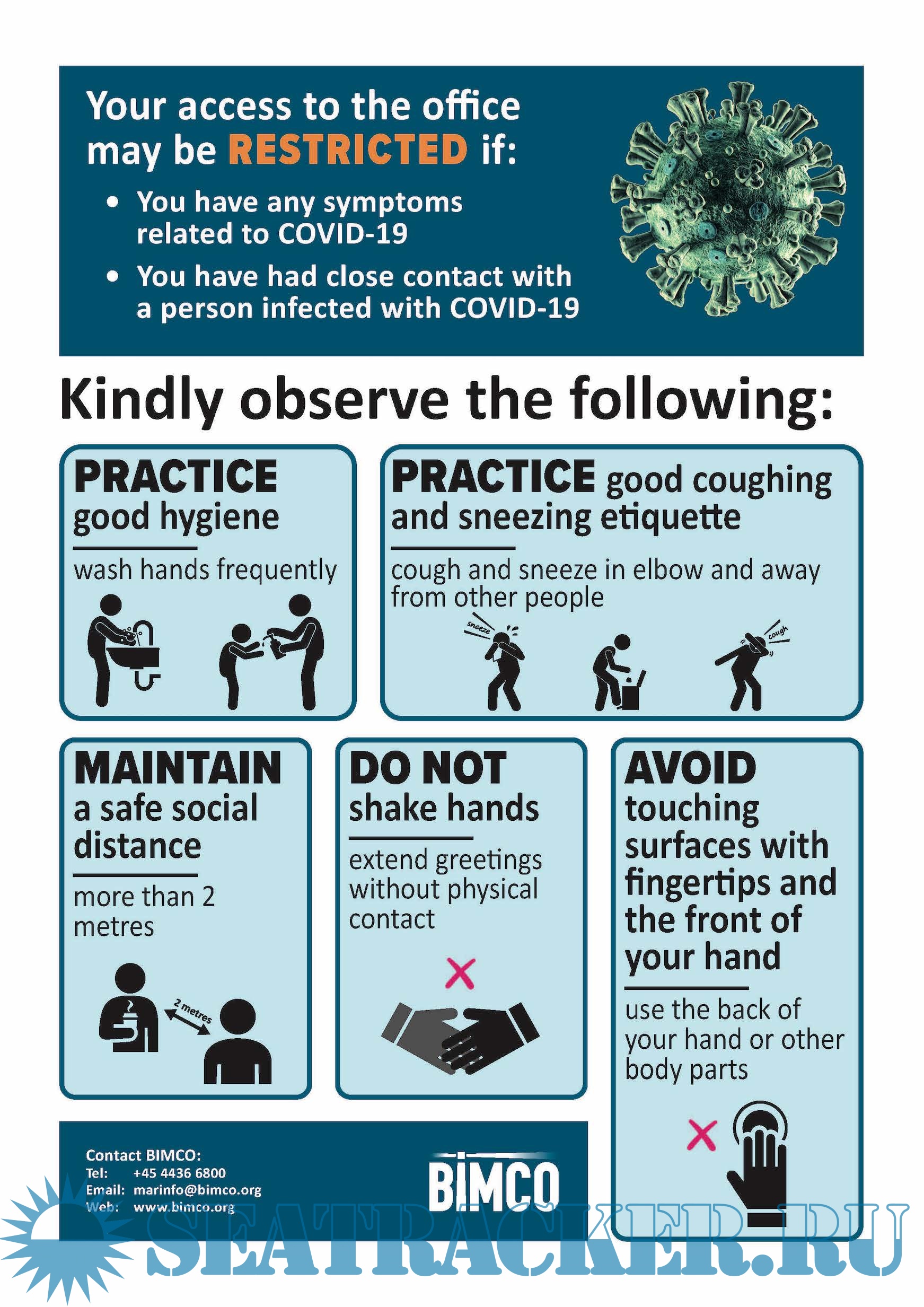 Year: 202x Language: english Author: BIMCO Genre: Other Format: PDF Quality: eBook Pages count: Multiple Description: BIMCO-made posters to protect seafarers and visitors onboard ships against Coronavirus (COVID-19). Black-and-white and coloured posters that can be easily printed and used onboard ships at shoreside, shipside of gangways as well at various locations in the accommodation.