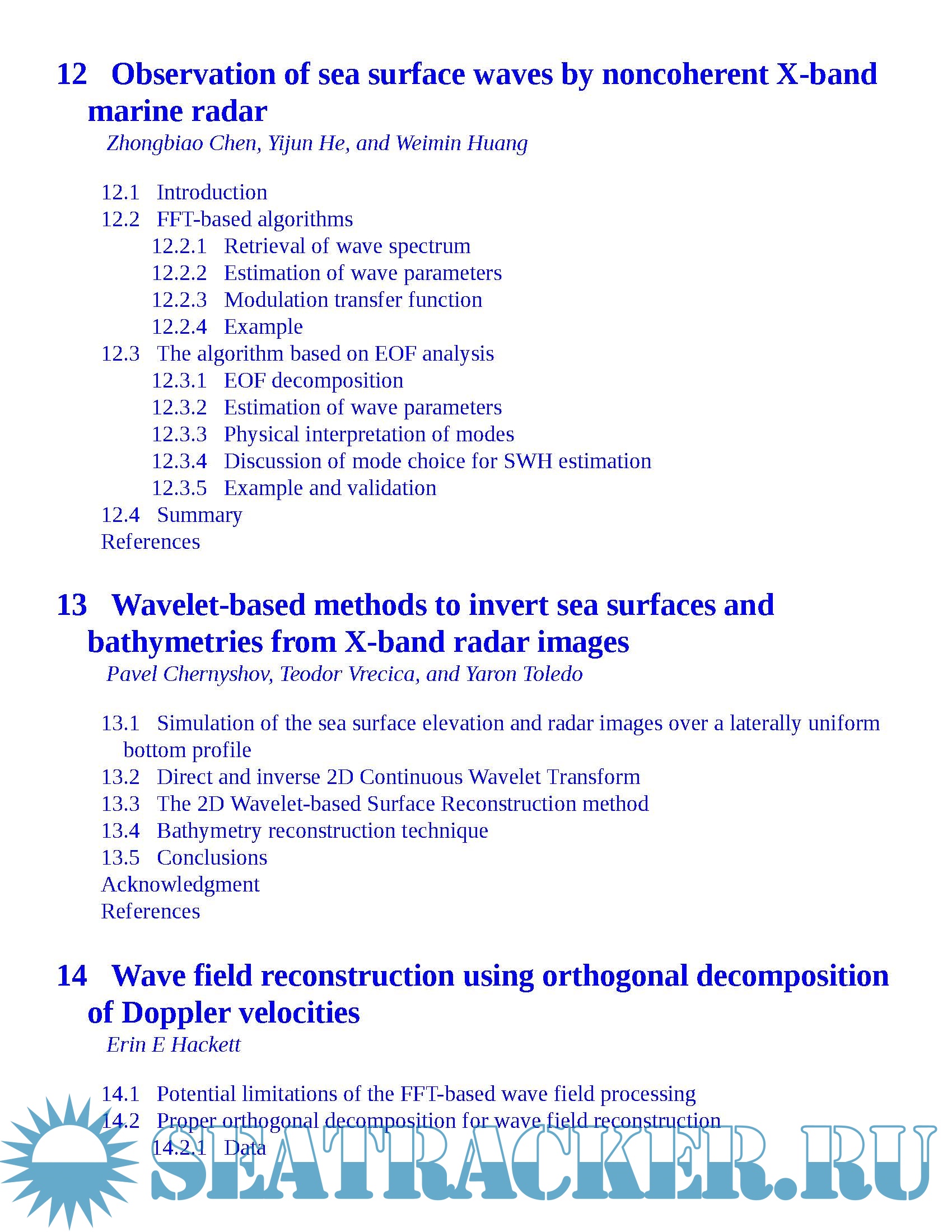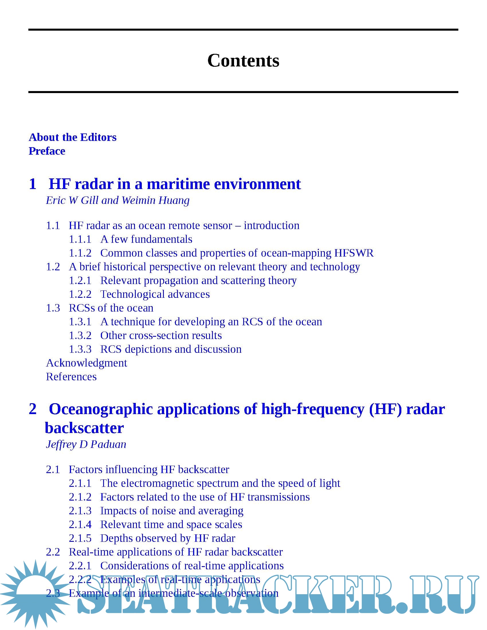 Description: A vast array of ocean instrumentation has been developed for research purposes since the middle of the twentieth century, among which remote sensing technologies have become increasingly important. Within this class of instruments, high frequency (HF) surface and skywave radar, microwave marine radar and global navigation satellite systems (GNSS)-based radar have been successfully implemented in gathering information on large tracts of the ocean surface. This book provides a systematic introduction to the principles, state-of-the-art methods and applications of HF surface and sky wave radar, microwave marine radar and GNSS-based radar, as well as an exploration of ongoing challenges in the field.