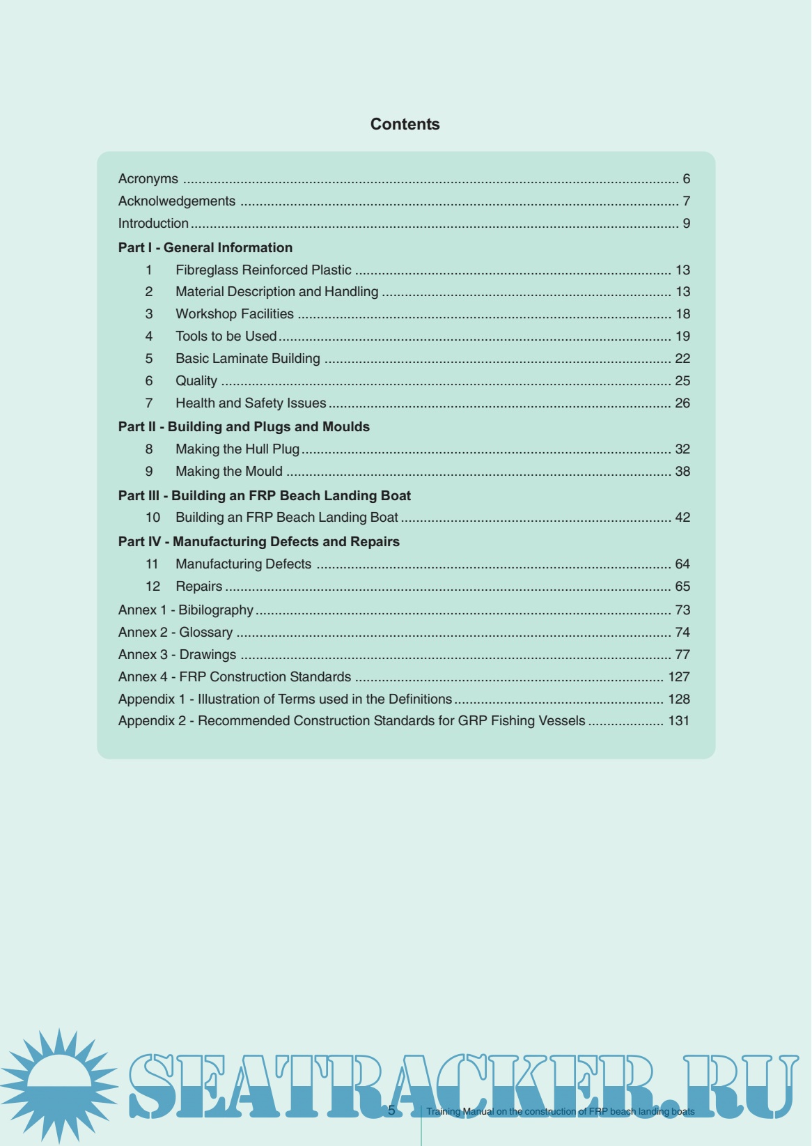 Description: This manual on construction of fibreglass reinforced plastic (FRP) beach landing boats has been prepared primarily to assist small boatyards in Tamil Nadu, India that build beach landing fishing boats, but may also be used as a guide for making good quality FRP boats as well as for FRP training in the region. The manual should be seen as a supplement to FRP boatbuilding manuals available in the Food and Agriculture Organization of the United Nations (FAO) and other international publ ications. It assumes prior knowledge of FRP hand lay-up processes and terms generally used in the industry. Recommendations on working conditions, materials and quality control are based on tropical ambient conditions and the type of boatyards likely to build such boats. Part I of the manual contains general information on FRP materials, handling and working conditions. Part II describes the building of a hull plug and a mould and Part III describes the building of a beach landing boat. Finally, Part IV contains information on manufacturing defects and repairs. The manual has four annexes that provide further information related to FRP boatbuilding. Annexes 1 and 2 contain a bibliography and a glossary, respectively. All drawings for the FAO IND-30 boat design are provided in Annex 3. Finally, Annex 4 contains the draft recommended construction standards for FRP fishing vessels. These standards are a part of the FAO/ILO/IMO Safety recommendations for decked fishing vessels of less than 12 m in length and undecked fishing vessels, which are currently under development.