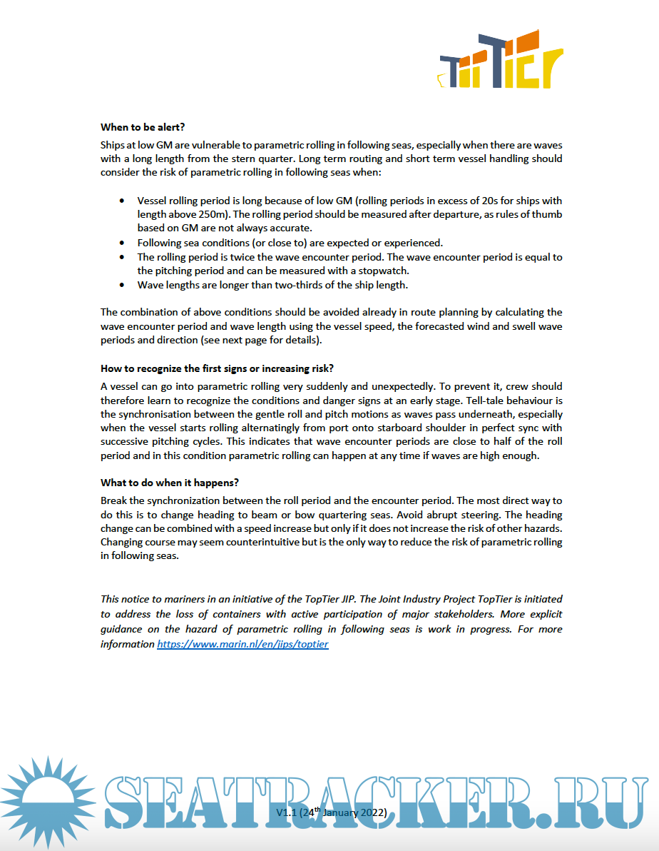 A series of incidents with exceptional container losses occurred during the winter season 2020-2021. The TopTier project was put in place by industry to find ways to avoid similar incidents in the future, and initial results show that parametric rolling in following seas was especially hazardous. This notice describes how container vessel crew and operational staff can plan, recognize and act to prevent parametric rolling in following seas.