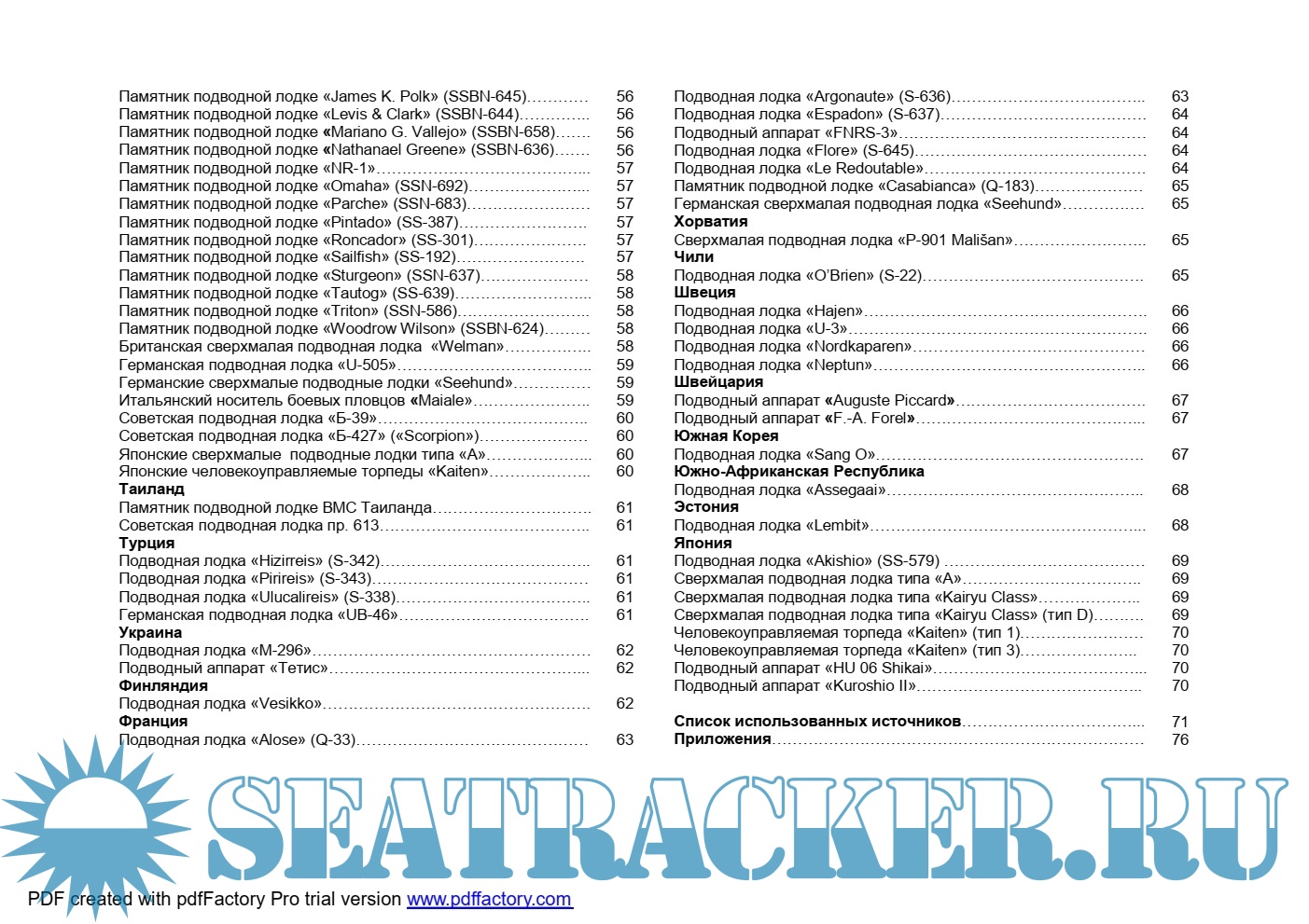 25 обитаемых подводных аппаратах, 18 носителях боевых пловцов, 8 человекоуправляемых торпедах, размещенных в музеях мира и 73 памятниках, созданных с использованием конструкций подводных лодок. Работа может быть полезна в деле военно-патриотического воспитания молодежи, представляет интерес для лиц, изучающих историю подводного плавания и военно-морского флота и организующих свой культурный досуг
