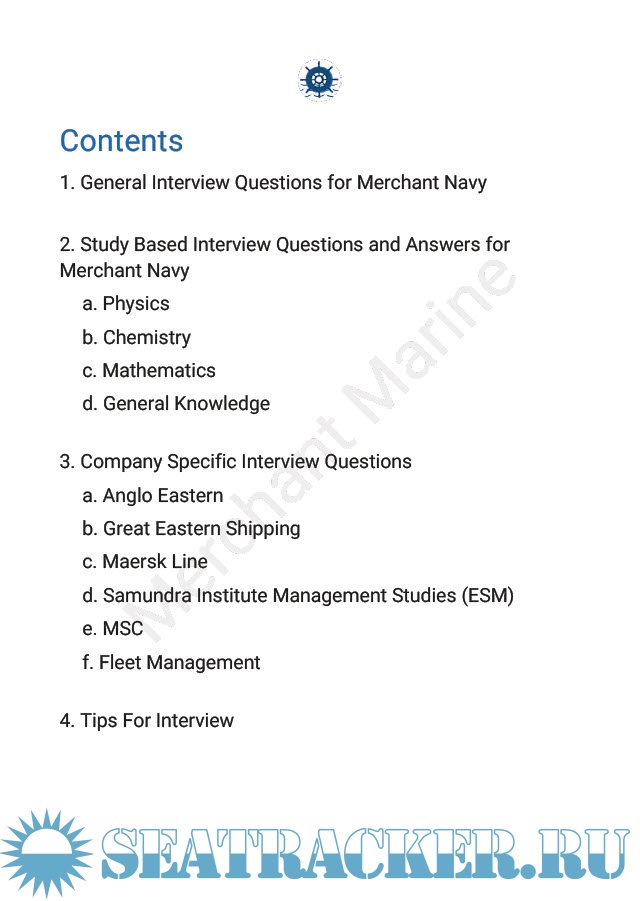 Year: 2020 Language: english Author: Merchant Marine Format: PDF Quality: eBook Pages count: 18 Description: This ebook covers most asked Interview Questions and Answers for Merchant Navy. Covers following topics: 1. General Interview Questions. 2. Study based interview questions. 3. Company specific interview questions. 4. Tips for interview.