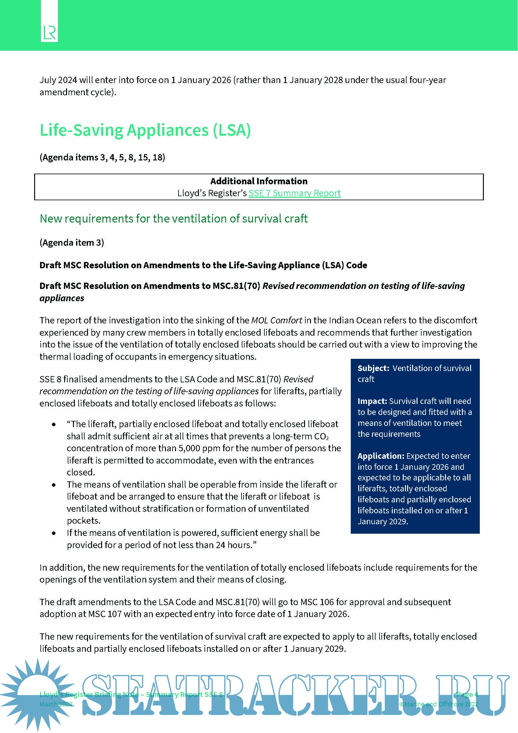 LR Summary Report for the IMO Ship Systems and Equipment Sub-Committee (SSE 8)