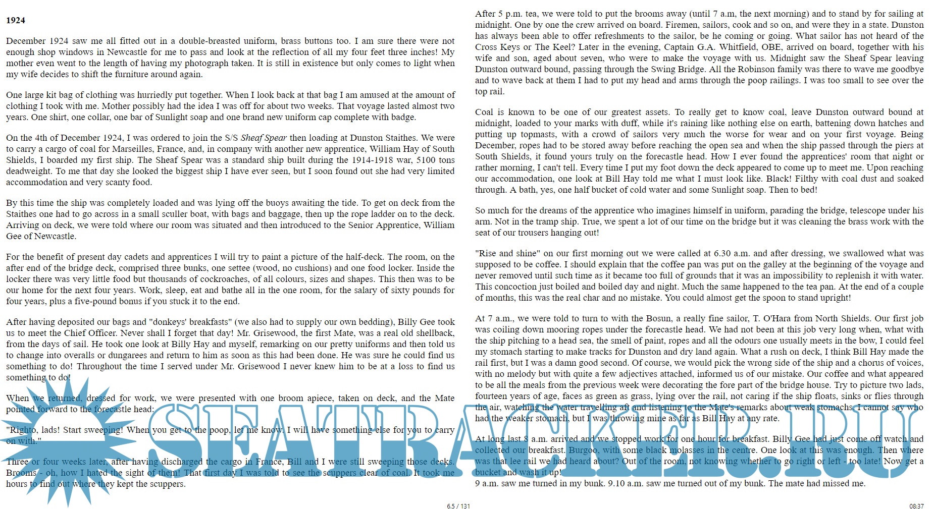 Description: This is the story of a boy of 14 who joined the Merchant Navy in 1924. Life at sea was hard then, but became even worse as the interwar depression deepened. Regrettably, George doesn’t appear to have written anything of his time between 1931 and 1940, but the story resumes to describe his harrowing experiences after the sinking of the Carlton by an Italian submarine.