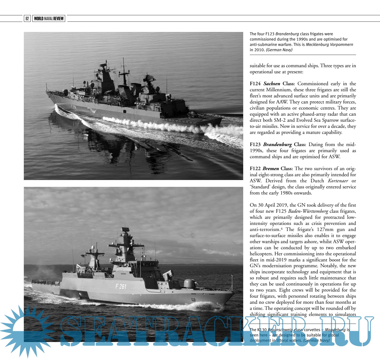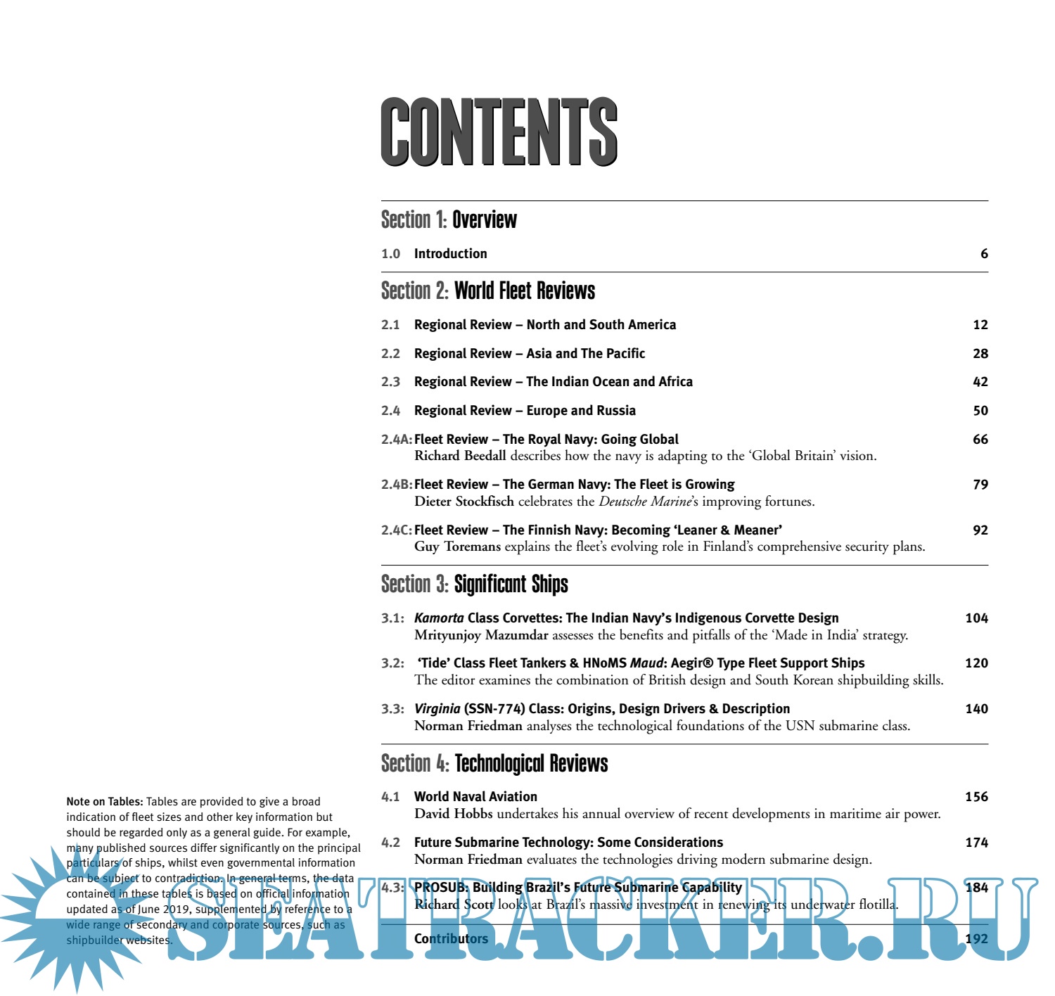 Features in this edition include in-depth coverage of the U.S. Navy's Virginia-class submarines, the Royal Navy's Tide class tankers, and the Indian P28 Komorto class corvettes. Technological subjects include assessments of recent developments in submarine technology by Norman Friedman, while David Hobbs' usual review of naval aviation focuses on the F-35 Lightning II. The next fleet reviews look at Finland and Germany and analyze how they are responding to the increased Russian threat.