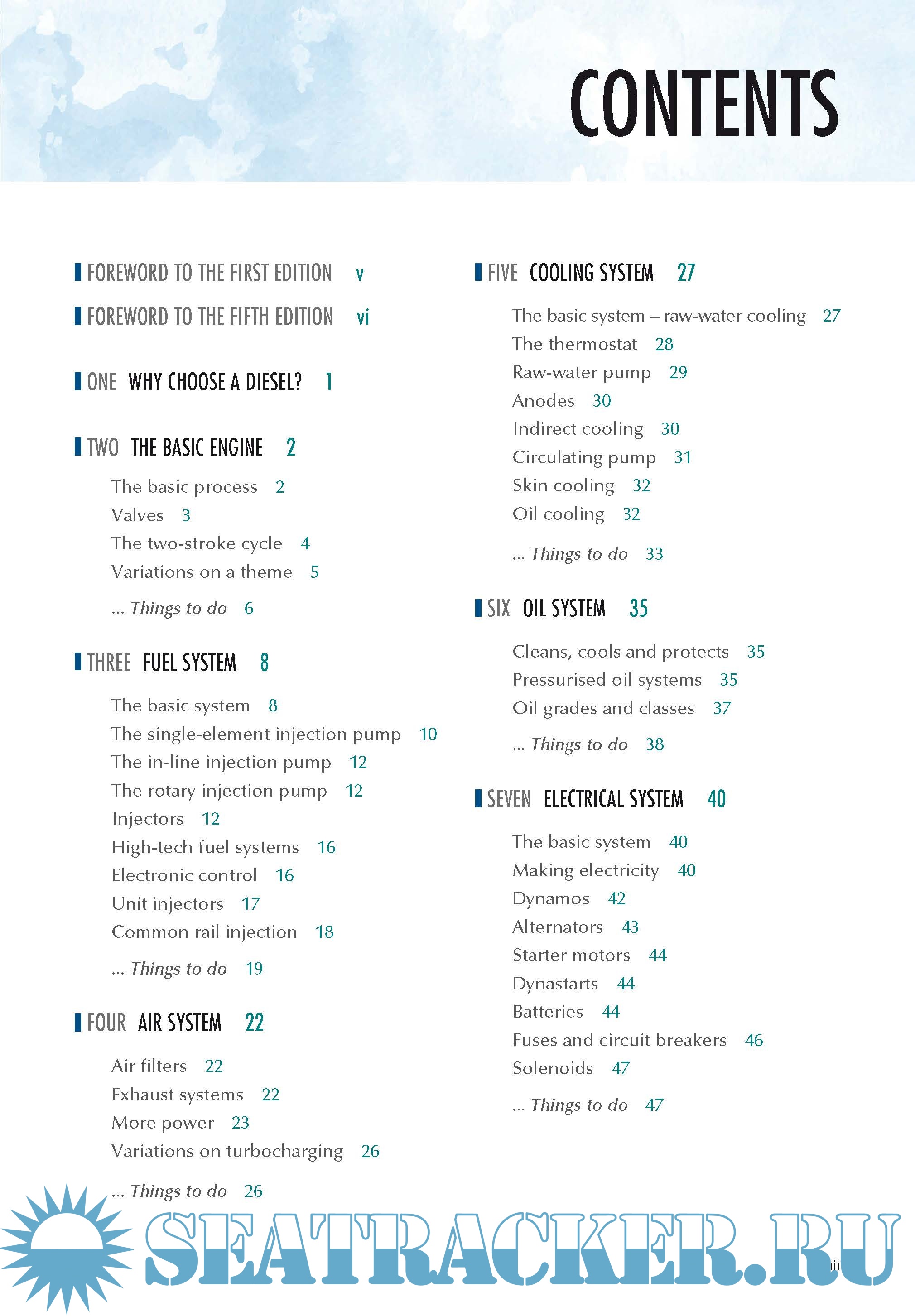 Year: 2018 Language: english Author: Mel Bartlett Genre: Handbook Publisher: Adlard Coles Edition: 5th ISBN: 9781472955425 Format: PDF Quality: eBook Pages count: 98 Description: The Adlard Coles Book of Diesel Engines is aimed at boatowners rather than experienced mechanics. In clear, jargon-free English, it explains how a diesel engine works, and how to care for it. Melanie Bartlett explains how the engine uses simple processes to covert fuel to power, and then looks at the various sub-systems that allow those processes to take place. She also advises on tools, winterizing and provides hints, tips and helpful fault-finding tables. Systems covered include: fuel, air, cooling, oil, electrical, propeller and transmission and control. This fifth edition has been thoroughly updated and illustrated with new full-color photos and diagrams. In particular, the Common Rail Injection System is covered, which governs how the fuel system is constructed, combined with the use of electronics (as opposed to mechanics) to control it thereby meeting the need for cleaner, greener engines to meet emissions regulations. : 4th Edition: https://seatracker.me/viewtopic.php?t=30194