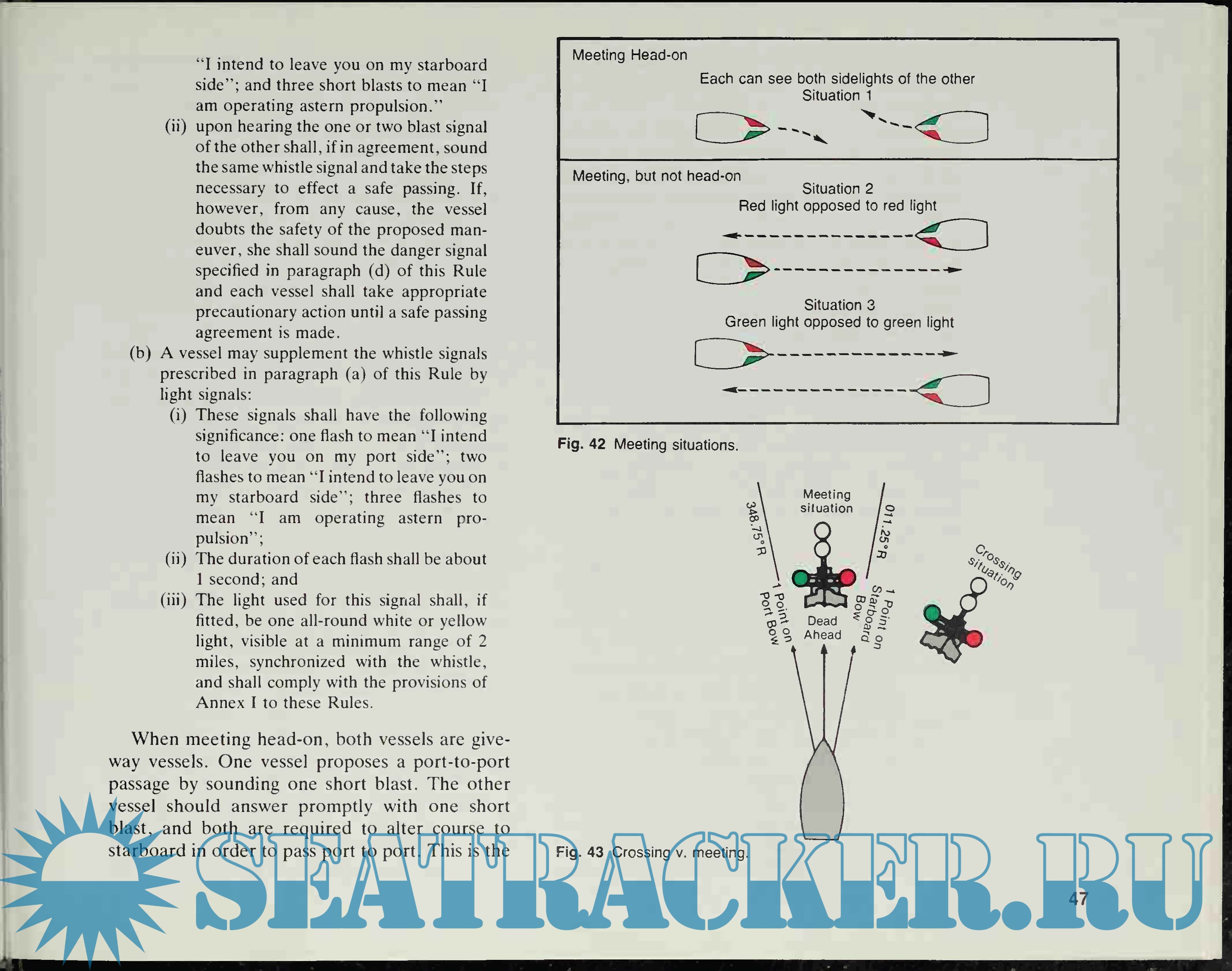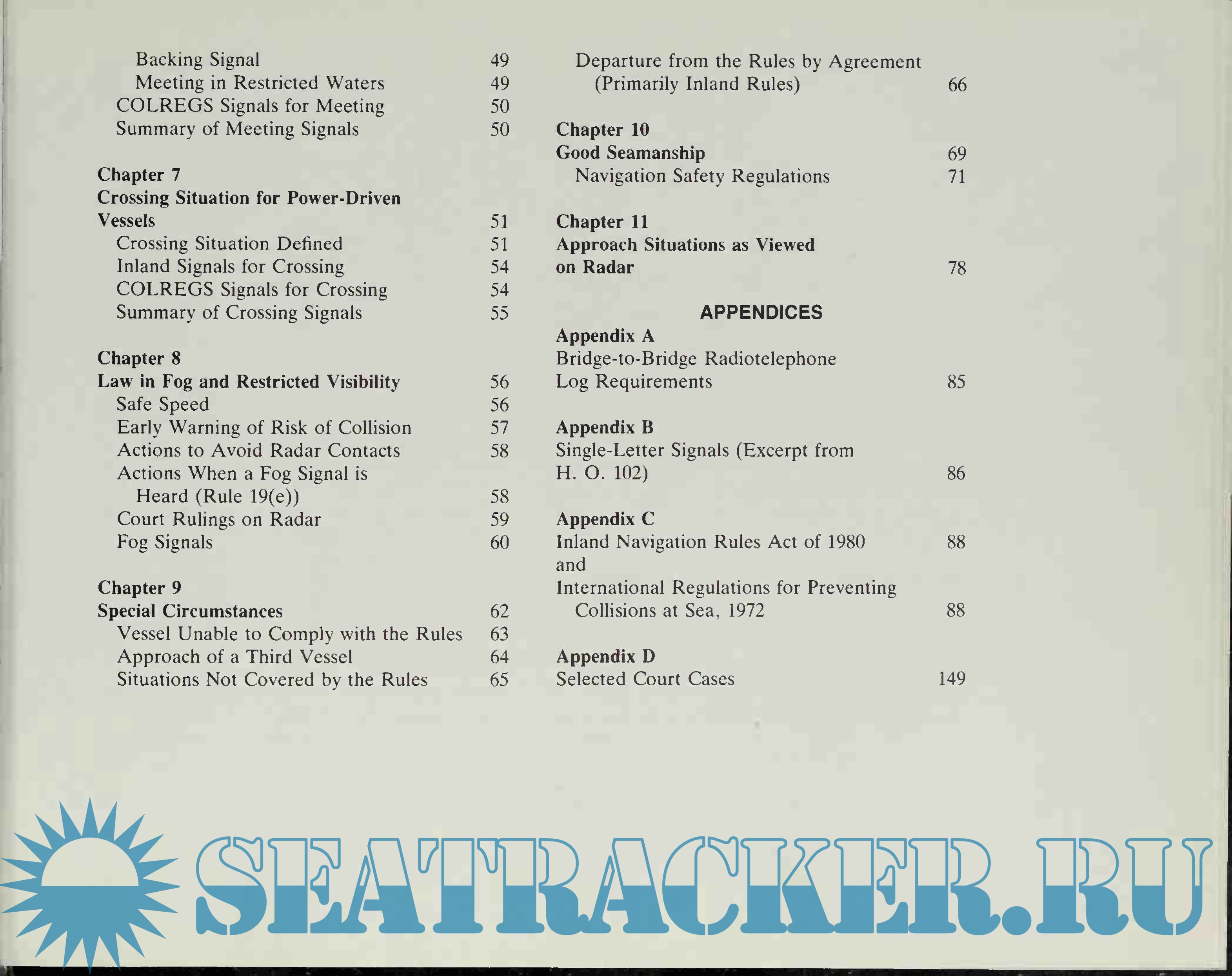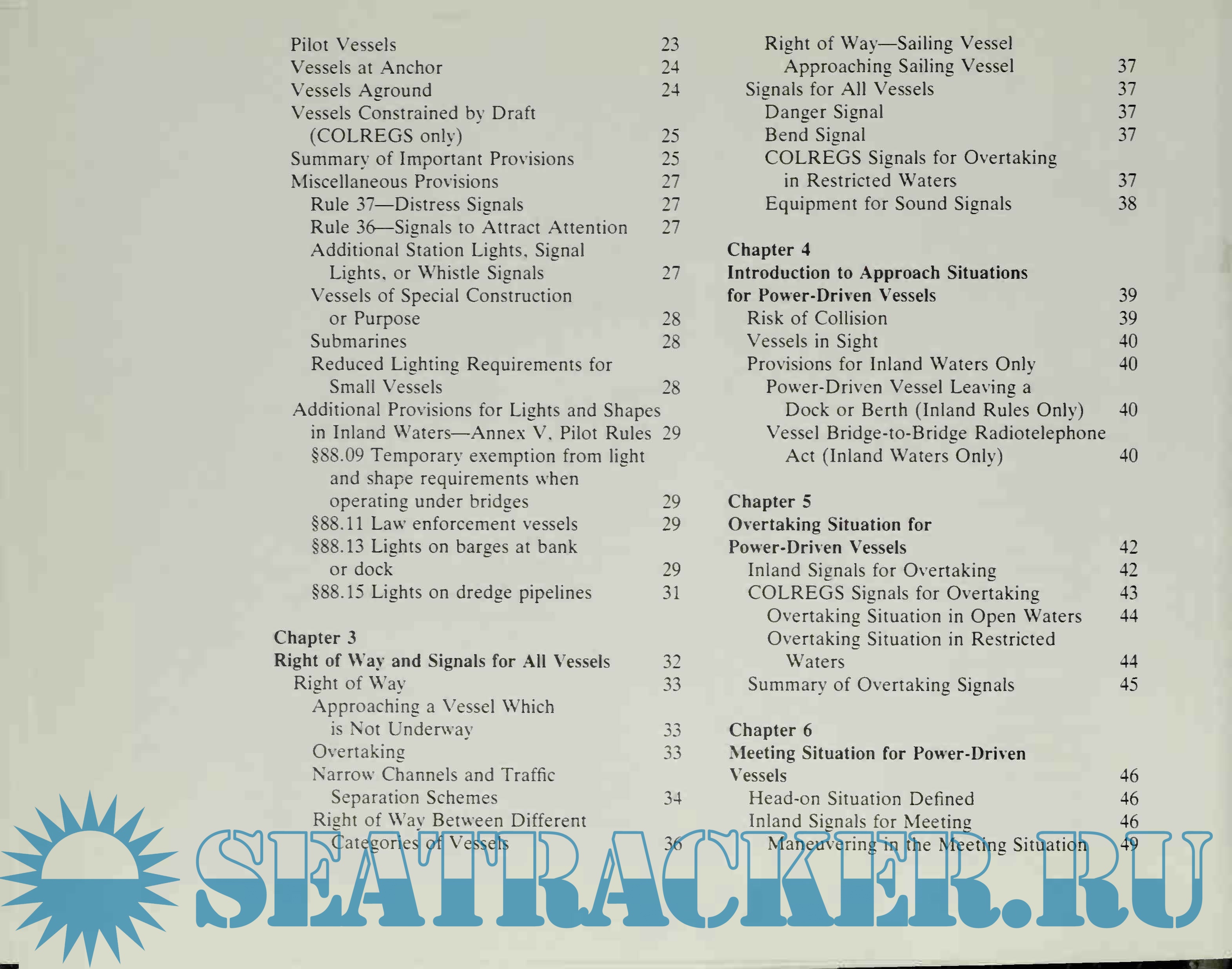 Year: 1984 Language: english Author: William H. Tate Genre: Guide Publisher: Naval Institute Press Edition: 2nd ISBN: 0870213555 Format: PDF Quality: Scanned pages Pages count: 174 Description: A Mariner's Guide to the Rules of the Road is designed to give a concise, comprehensive treatment of the rules of the road for US Inland waters as well as for international waters. Because the Inland Rules have not been significantly updated for many years, a good deal of court interpretation has been included. It is the opinion of the author that court interpretations of the 1972 International Rules will not significantly change the knowledge required of the mariner for several years to come. Book is full of illustrations and diagrams.