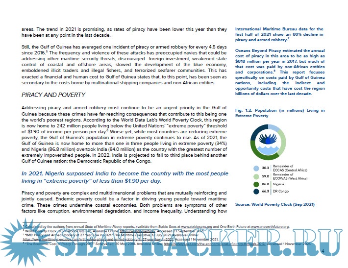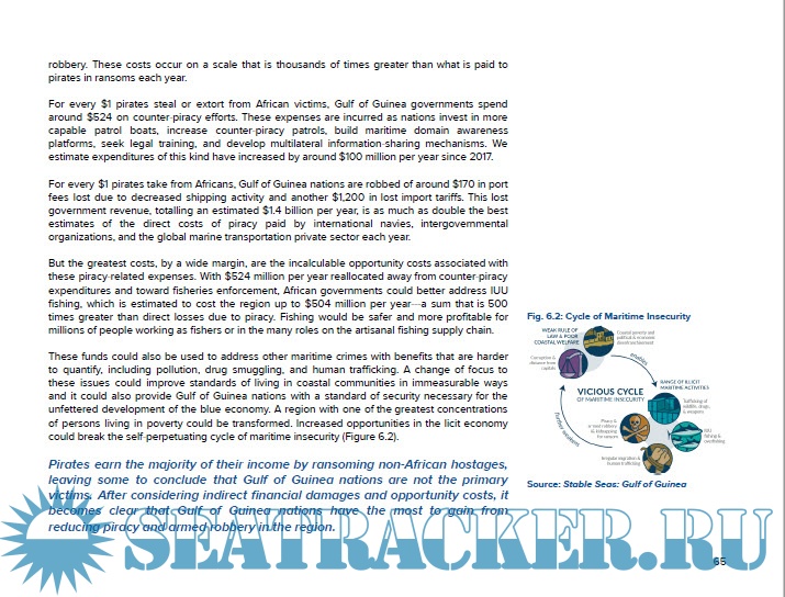 Year: 2021 Language: english Author: Curtis Bell Genre: Research papers Publisher: Stable Seas Edition: November Format: PDF Quality: eBook Pages count: 68 Description: Pirate groups concentrated in the Niger Delta earn perhaps $5 million of direct income per year through theft and hostage-taking. The majority of this income---nearly $4 million per year---is stolen and extorted from non-African entities seeking the release of non-African hostages. These low direct costs to African nations have created the perception among some that Gulf of Guinea piracy and armed robbery are greater problems for international shipping companies and foreign seafarers than they are for African nations. According to this view, these crimes happen in Africa, but they do not typically happen to Africa. Gulf of Guinea waters are crime scenes, but Gulf of Guinea nations are not the primary victims. The implication is that those paying ransoms and suffering direct financial losses have the most at stake. This report shows that this perspective is misguided. Gulf of Guinea nations are facing significant direct, indirect, and opportunity costs related to the presence of piracy and armed robbery. These costs occur on a scale that is thousands of times greater than what is paid to pirates in ransoms each year.