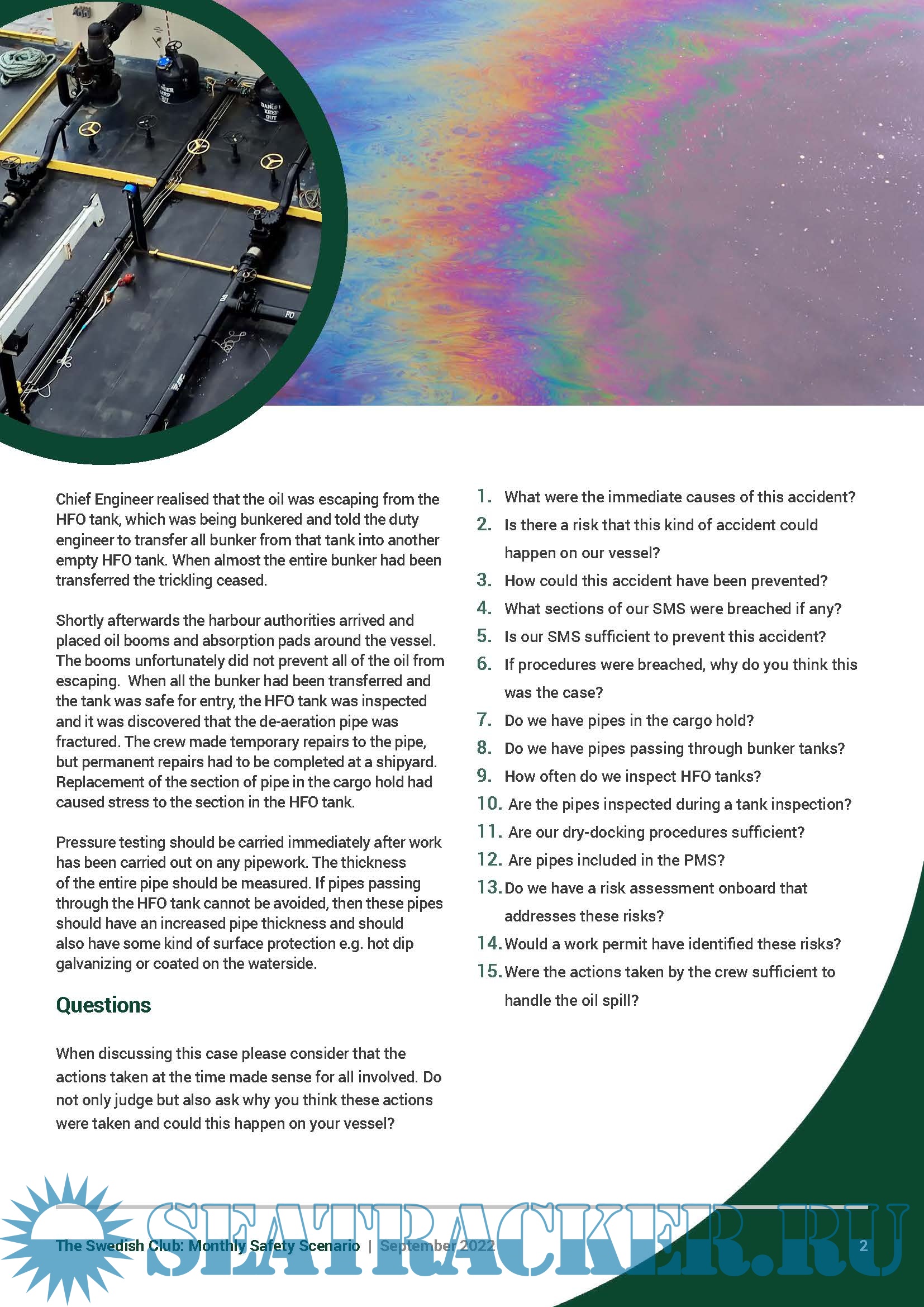 Year: 2022 Language: english Author: the Swedish Club Genre: Periodical (magazine) Format: PDF Quality: eBook Pages count: 3 Description: The Club is publishing, on a monthly basis, a new Monthly Safety Scenario (MSS) to assist owners in their efforts of complying with the above regulations. Alternative scenarios will be uploaded in SCOL. It is easy to download the MSS and enter the written conclusions from the meeting and send feedback to the shore-based organisation. Under the ISM requirement, owners are obliged to carry out monthly safety meetings or safety committee meetings onboard their vessels. This obligation stems from Chapter 5 of the ISM Code: “Master’s responsibility and authority” and furthermore from “5.1.2, motivating the crew in the observation of that policy”. The obligation can also be derived from the Code of “Safe Working Practices for Merchant Seamen”, where it is stated that the safety committee should meet regularly: “3.13.2, The frequency of meetings will be determined by circumstances but as a general guideline, the committee should meet about every 4-6 weeks”