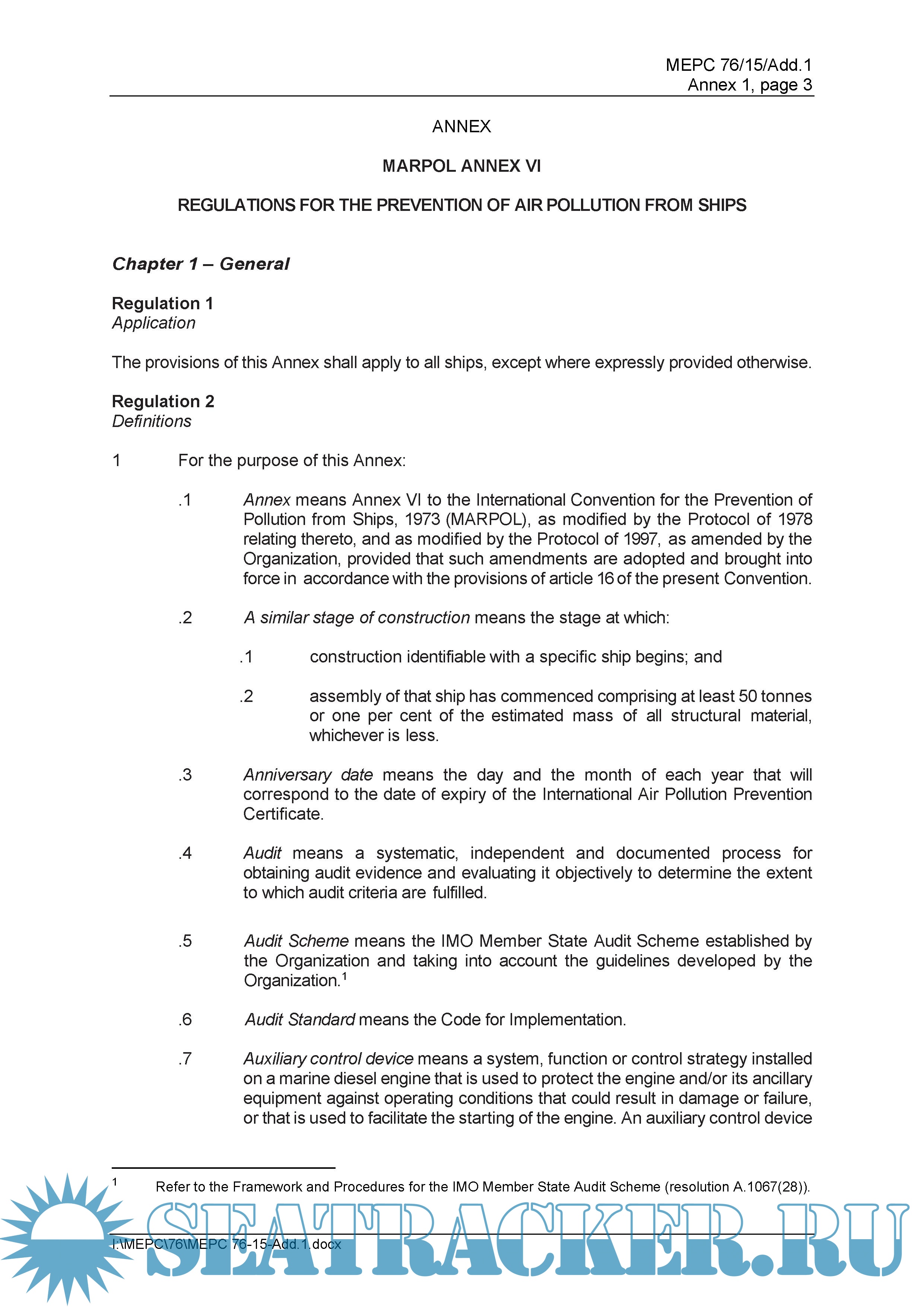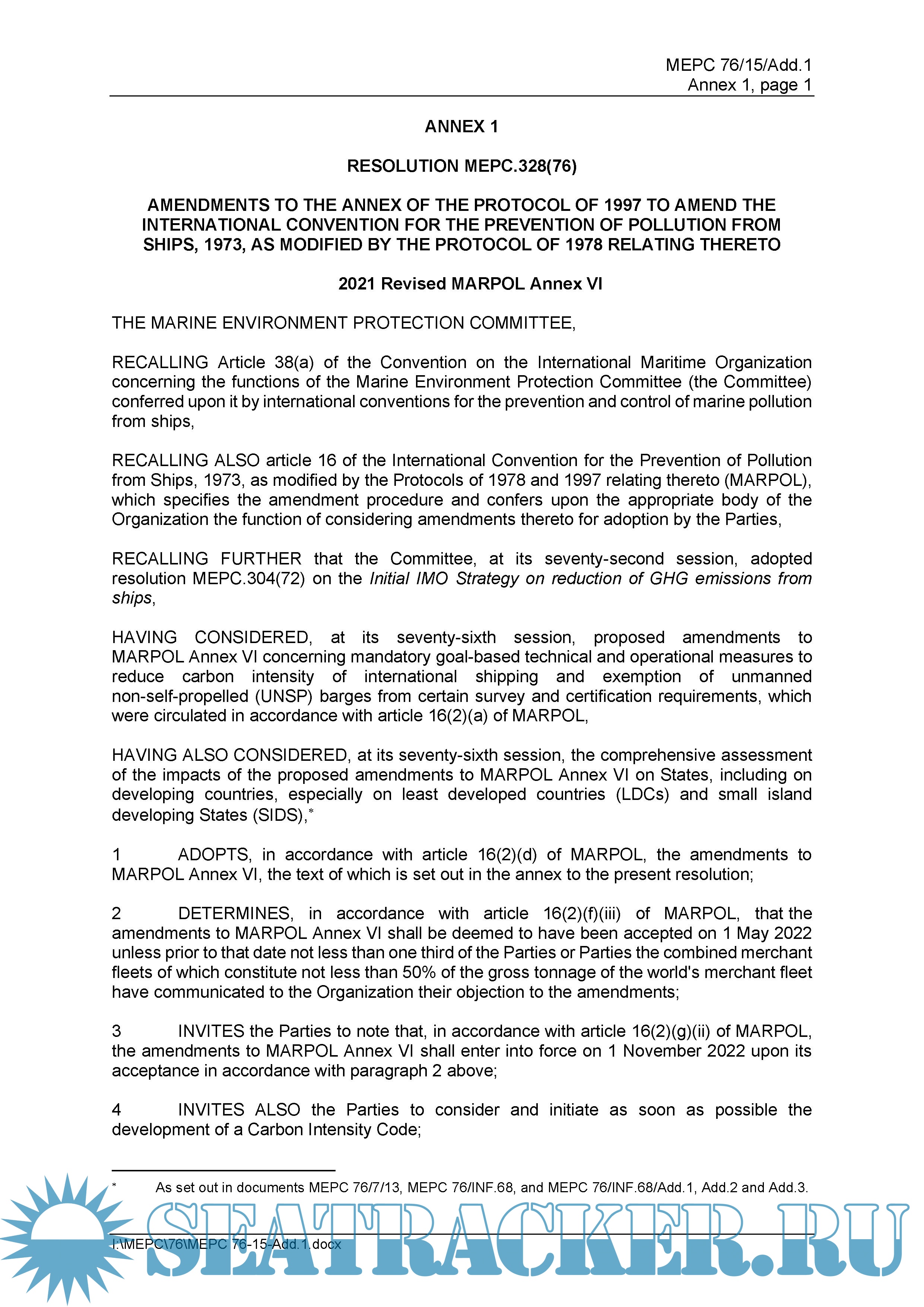Amendments to various regulations of MARPOL Annex VI, in particular, due to the adoption of new regulations 23, 25 and 28 to reflect the technical and operational carbon intensity reduction measures, led to the adoption of Resolution MEPC.328(76) – 2021 Revised MARPOL Annex VI.