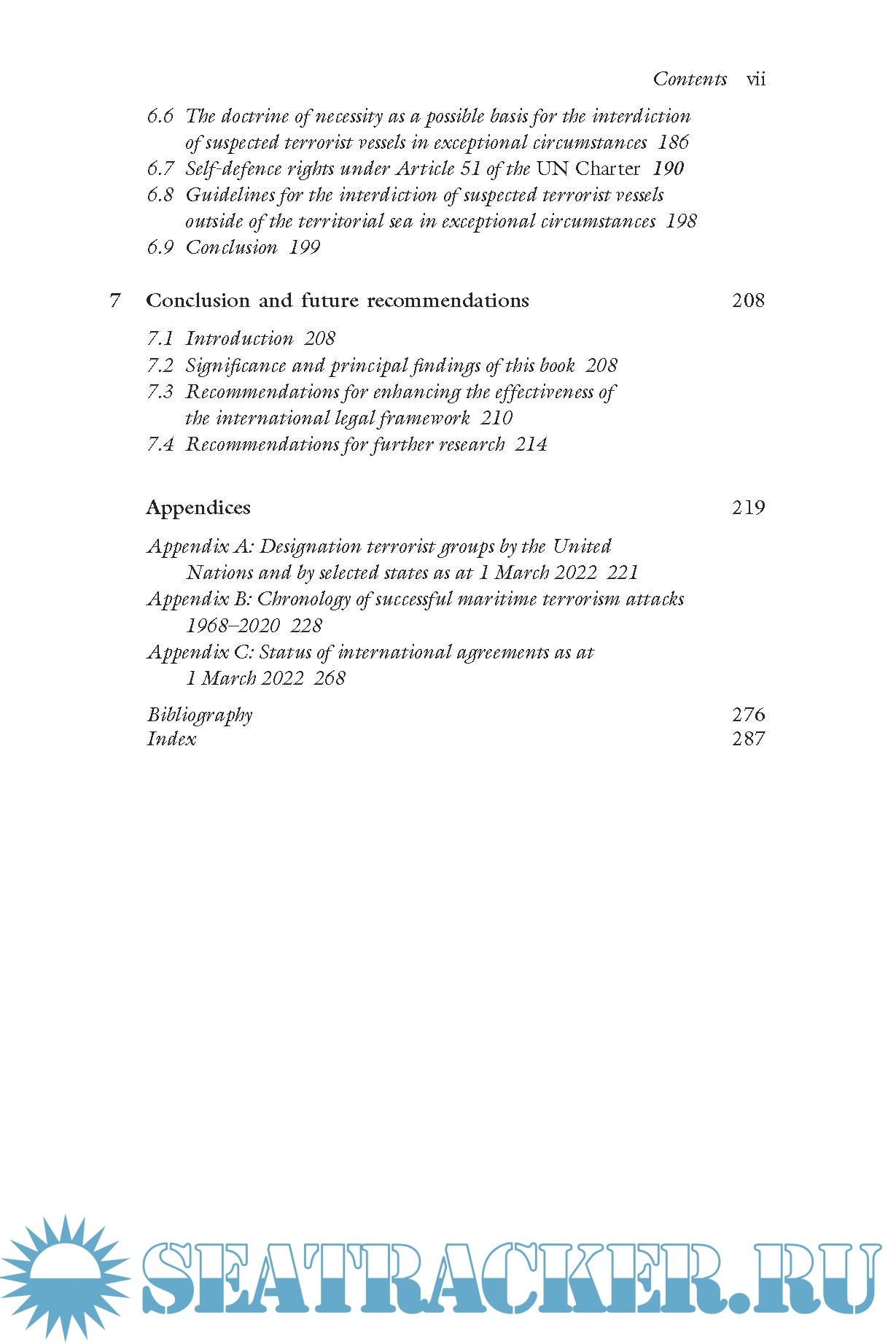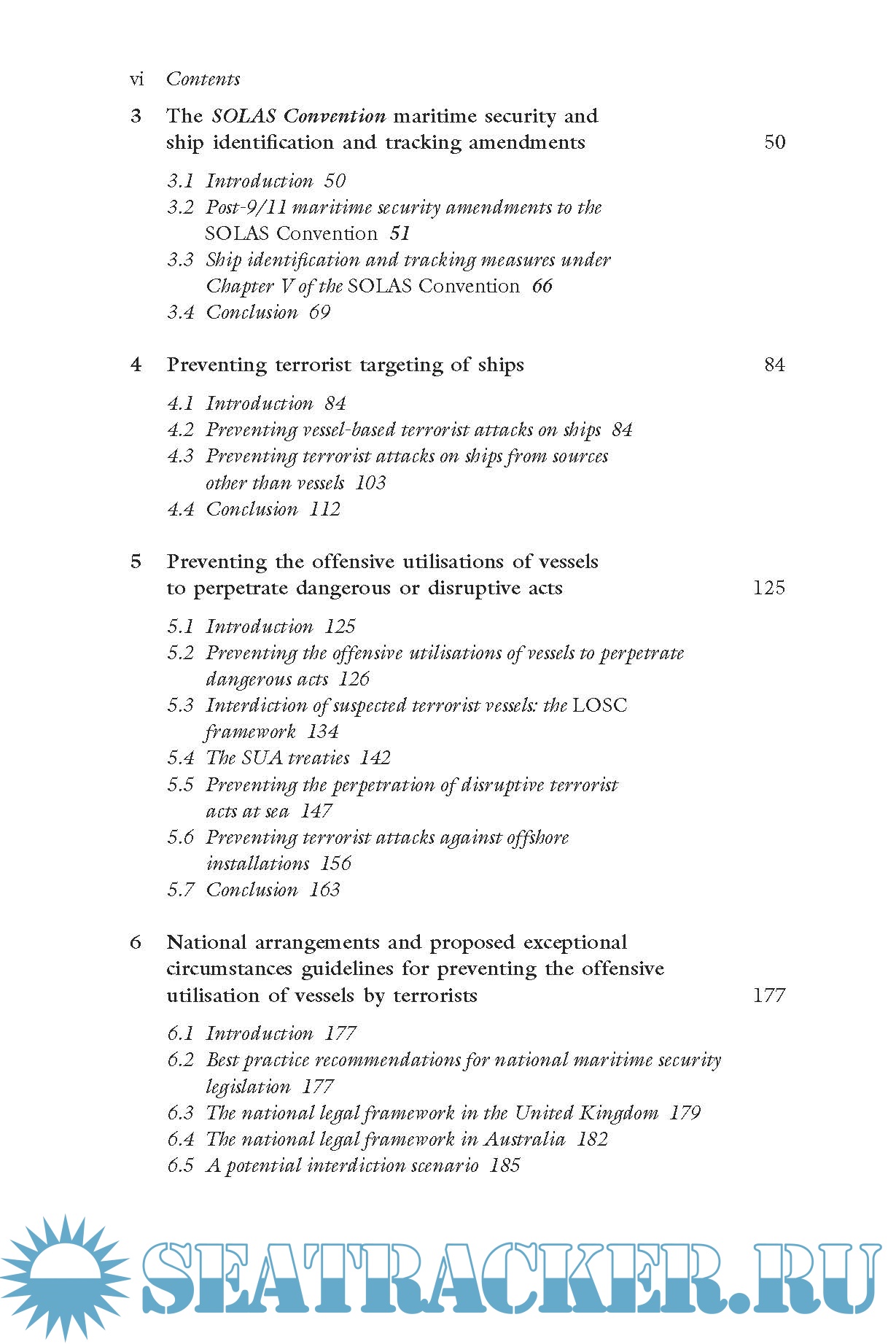 After discussing the overlaps and distinctions between piracy and maritime terrorism, this book considers how the International Ship and Port Facility Security Code, and other vessel identification and tracking measures in the 1974 International Convention for the Safety of Life at Sea, would be likely to reduce the risk of terrorist attacks at sea. It explains how the 1982 United Nations Convention on the Law of the Sea is less than clear on the powers of states to protect offshore installations, submarine cables and pipelines from interference by terrorists. In light of these uncertainties, it considers how the 2005 Protocol to the Convention for the Suppression of Unlawful Acts Against Maritime Navigation, the doctrine of necessity and states’ inherent self-defence rights might apply in the maritime security context.