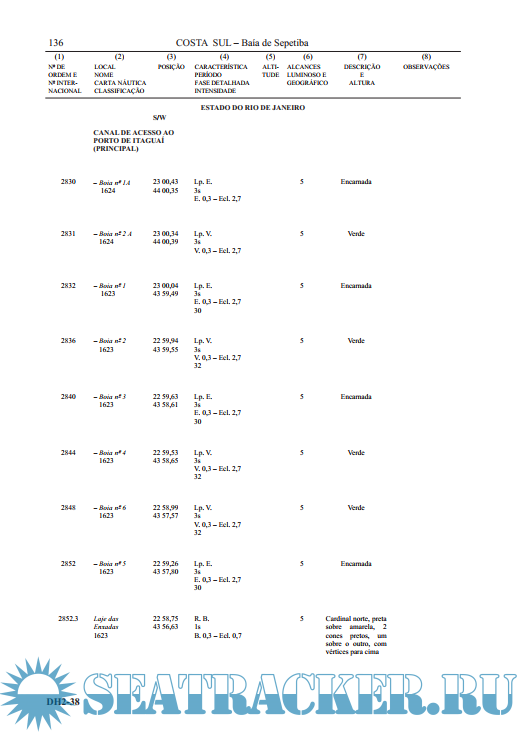 Description: The List of Lighthouses (DH2) is a navigation aid publication edited by the Directorate of Hydrography and Navigation (DHN) and updated by the Navy Hydrography Center (CHM), in accordance with with the Technical Resolutions of the International Hydrographic Organization (IHO). It contains all the information about lighthouses, airlights, boat lighthouses, lighthouses, light buoys and particular lights or aerial obstacles that are of interest to navigators, existing on the coast, in the rivers, in the lagoons and on the islands of the