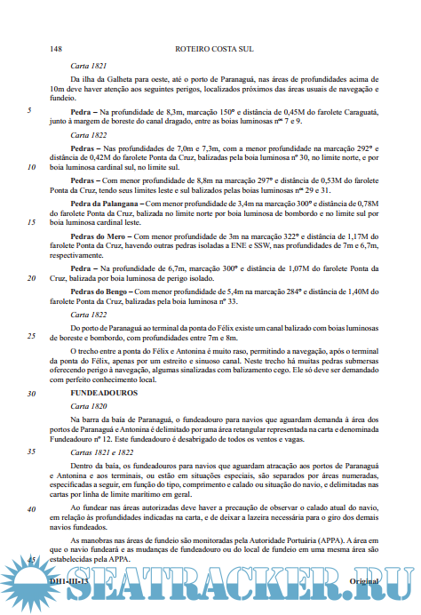Description: INTRODUCTIONPurpose – The purpose of the Roteiro da Costa do Brasil is to complement Brazilian nautical charts – never to describe them – giving sailors subsidies that allow them to better evaluate the information on the charts, when navigating along the coast or channels and at landings, as well as how to know the regulations, resources and port and terminal facilities.When navigating along the coast, an attempt is made to show the general aspect of the coast, with information on characteristic geographic points, isolated structures and navigation aids that allow identifying them to determine the position of the ship, dangers existing in the usual routes, winds, currents ocean areas, restriction areas and activities to navigation and the most usual or recommended routes, whenever possible between two ports.On landing, the description is made in the sequence in which the characteristic geographical points become visible and the dangers exist, up to the point of anchorage or embarkation from Prático, for navigators approaching from the most frequent directions. When there is more than one navigable channel, they are addressed in descending order of their importance, followed by information about the dangers existing in their vicinity.In the description of the characteristic points and dangers, if all the important details for the navigator can be seen in the chart, the point or danger is mentioned briefly, the necessary for its identification in the chart; if there is more information available than those shown on the chart, they are given in the Roadmap.With regard to ports and terminals, an effort is made to inform sailors what they need to know before arrival, with a view to aspects of navigation safety, traffic and permanence, port operation and legislation, refueling and facilities miscellaneous.Division – The Route of the Coast of Brazil is divided into three volumes: