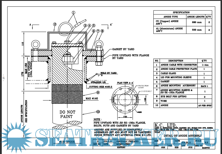 The anode are usually mounted in pairs in the ship’s sea chest or strainer where they are in direct contact with the flow of water entering the seawater lines.