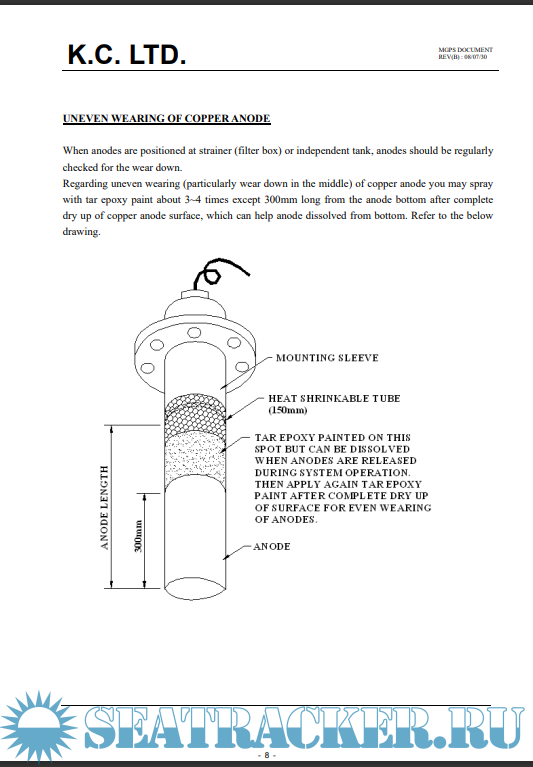 K.C. system is based on the electrolytic principle and consists of copper, aluminium and ferrous anodes which are fed with an impressed electrical current from a control panel.