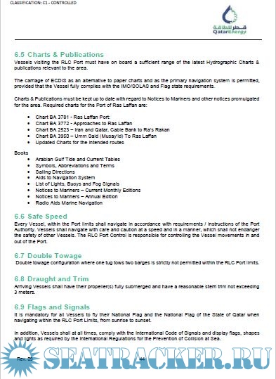 Description: This document has been written for reference and use by all the port users namely masters of seagoing vessels calling Ras Laffan Port, Agents, Shipping lines, Consignees, Shippers, publishers of nautical information and or any other party that transacts business through the Port.