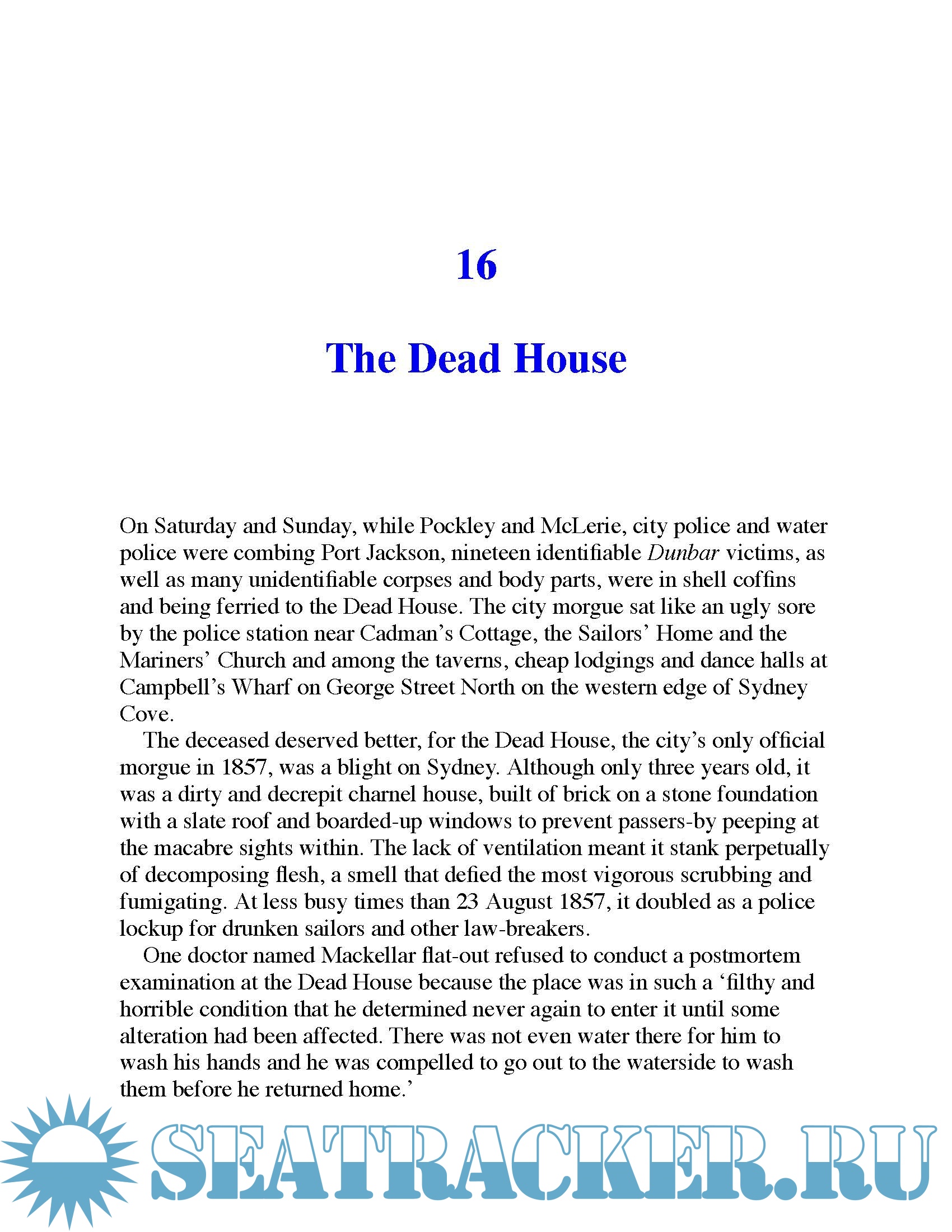 Description: The epic story of one of Australia's greatest maritime disasters, the wreck of The Dunbar. At the top of The Gap, the haunted cliffs that front the coast of Sydney's Watsons Bay, sits a massive, battered anchor. It belonged to the Dunbar, an 1186-tonne three-masted clipped en route to Sydney from Plymouth, England, that was swept by a gale onto the rocks at South Head on August 20, 1857. All but one of the 123 crew and passengers perished: drowned, dashed on rocks or mauled by sharks.