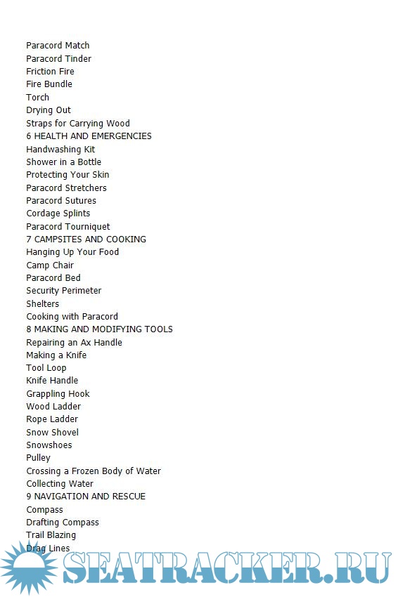 Step-by-step instructions to make a paracord bracelet, quick deploy bundle, pace count beads, water filter, and much more
