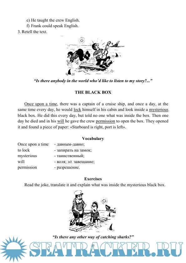 Настоящее учебное пособие предназначено для студентов Московской государственной академии водного транспорта, обучающихся по специальности «Судовождение», достаточно овладевших основами грамматики английского языка. Шутки и короткие рассказы, представленные в данном пособии, направлены на реализацию потребностей обучаемого в самостоятельном чтении для удовольствия, однако, они могут быть использованы в учебном процессе как основа для игровых ситуаций и обсуждений.
