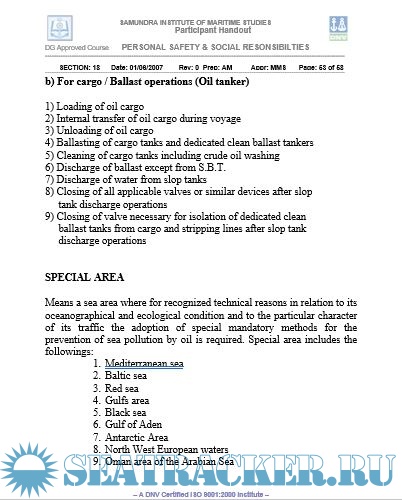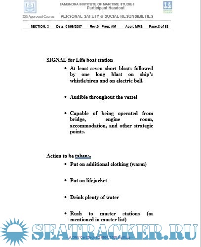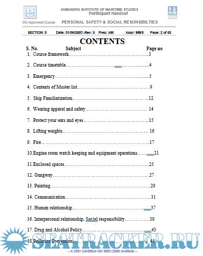 Description: This course, called the Personal Safety and Social Responsibility, aims to provide familiarization, basic safety training and instruction for safe working procedures and social responsibility aboard ship. It is based on the guidance on training in section A-VI/ 1 of the STCW 1978 as amended in 1995 (STCW 1995) Section A-VI/1-4. Appendix M-VI/1D of Meta Manual Vol.II and IMO Model course 1.21 have been used in preparation of material for this course.