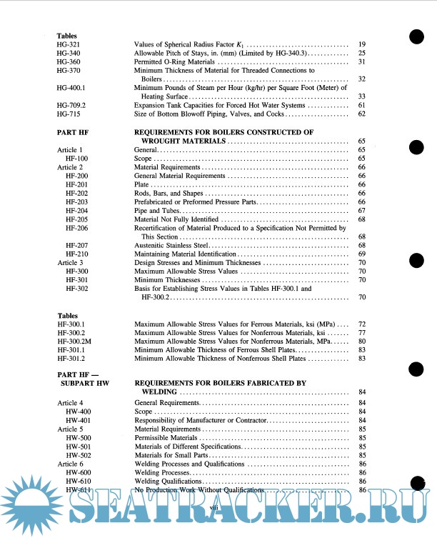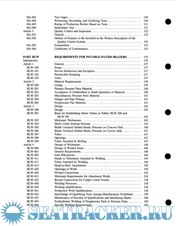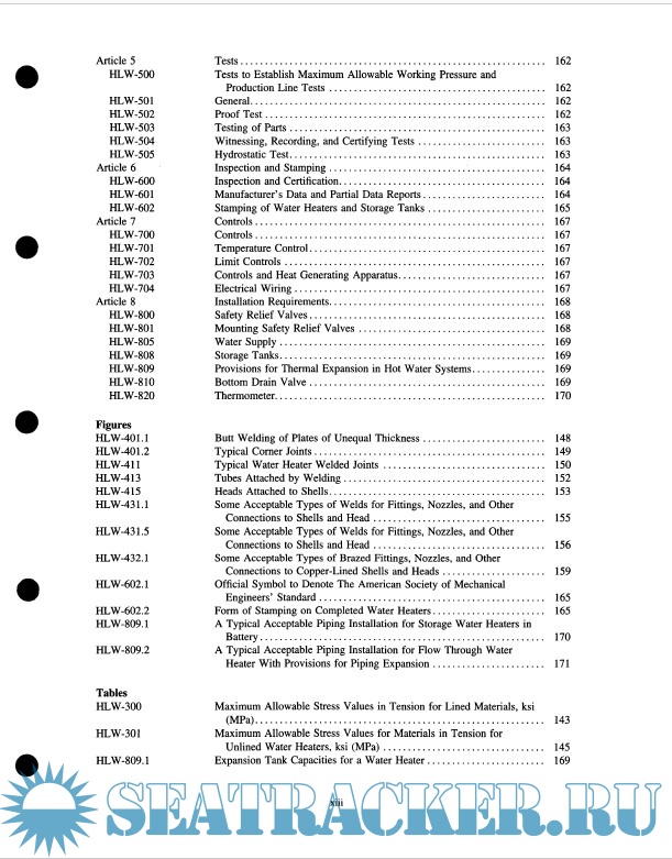 This Section provides requirements for design, fabrication, installation and inspection of steam heating, hot water heating, hot water supply boilers, and potable water heaters intended for low pressure service that are directly fired by oil, gas, electricity, coal or other solid or liquid fuels. It contains appendices which cover approval of new material, methods of checking safety valve and safety relief valve capacity, examples of methods of checking safety valve and safety relief valve capacity, examples of methods of calculation and computation, definitions relating to boiler design and welding, and quality control systems. Rules pertaining to use of the H, HV, and HLW ASME Product Certification Marks are also included.