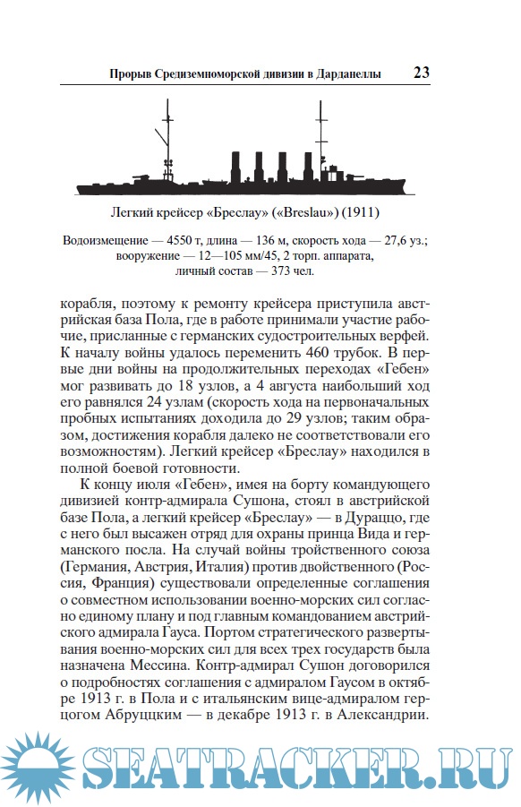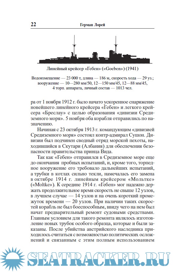 Подробнейшим образом освещаются деятельность и судьба крейсеров "Гебен" и "Бреслау", о чем до публикации Лорея в 1937 г. даже в Германии не было полных сведений.
