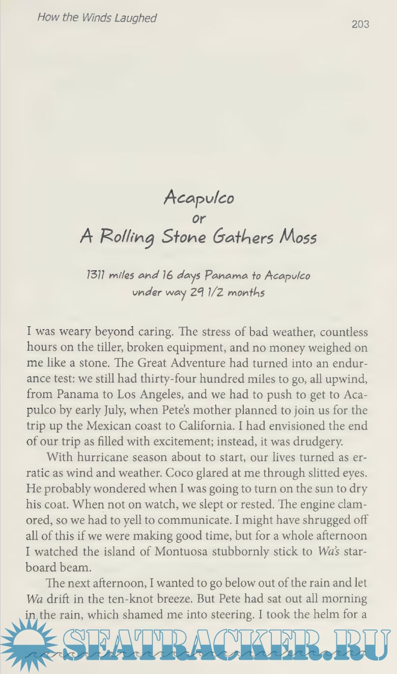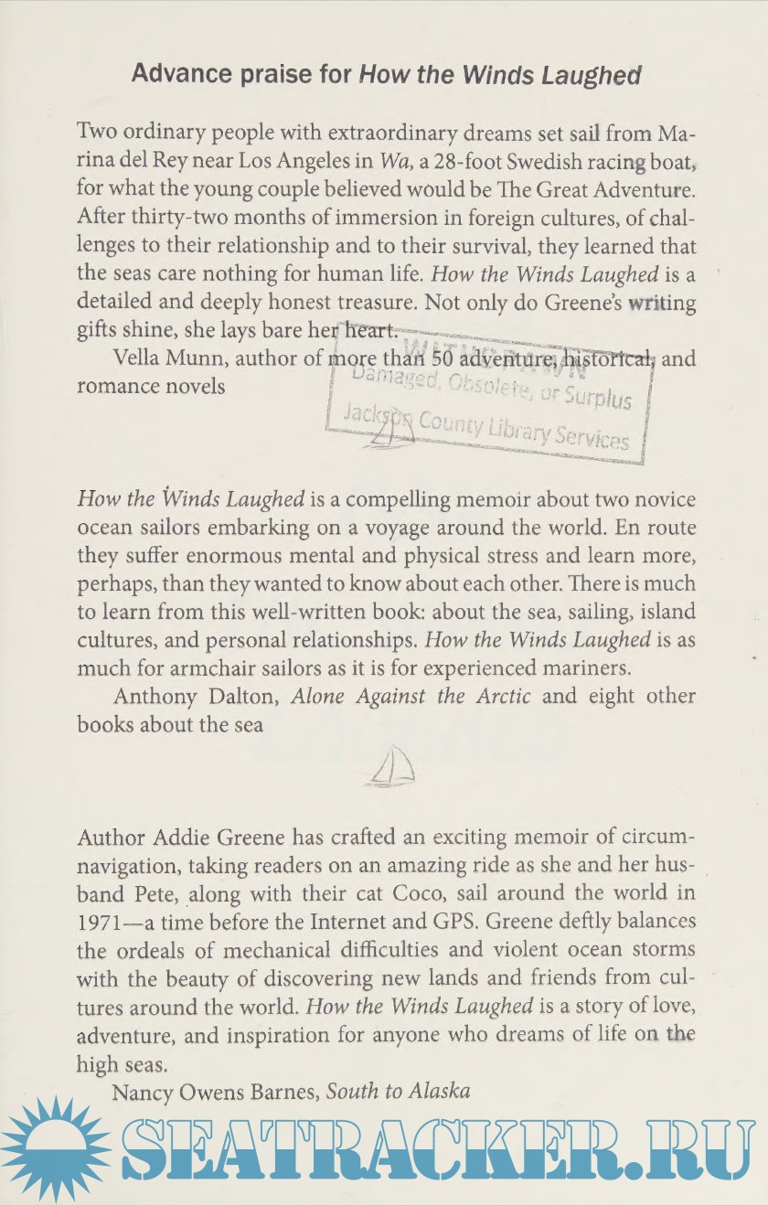 Description: In the beginning, Addie Greene is afraid to climb a mast, even at dock, or change sails on a bucking foredeck washed with breaking waves. Yet as she and her young husband take on the great adventure of circumnavigation in a 28-foot boat, a succession of catastrophes demands that she become the driving force in carrying them forward and eventually safely home. How the Winds Laughed sails on the wings of hope, fear, anger, and love across three oceans and more than 30,000 miles. A coming-of-age quest, it drenches the dreams of Don Quixote with the ignoble reality of Sancho Panza.